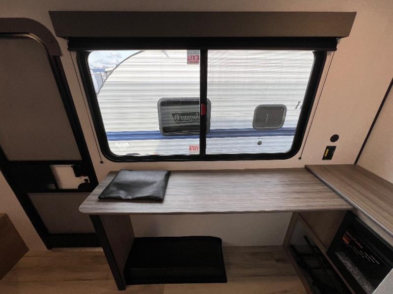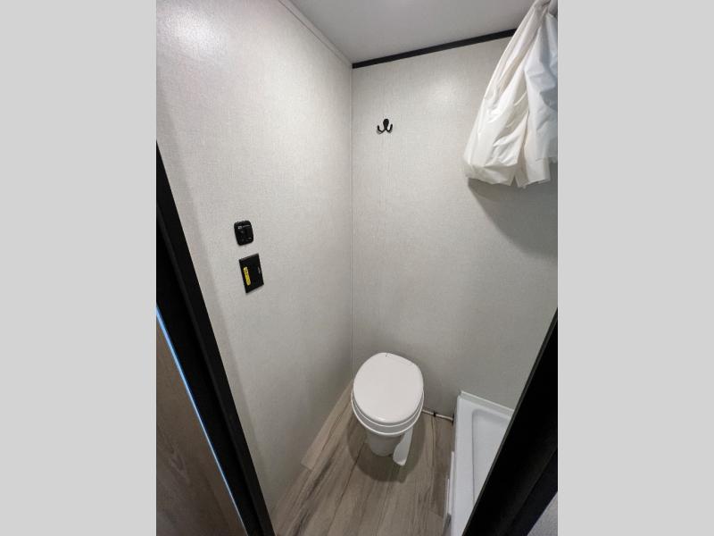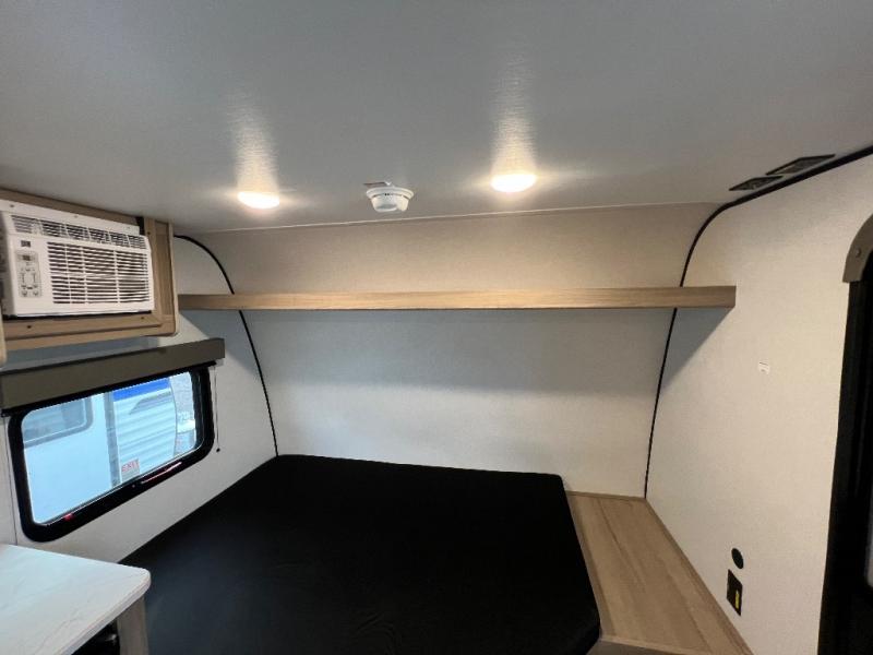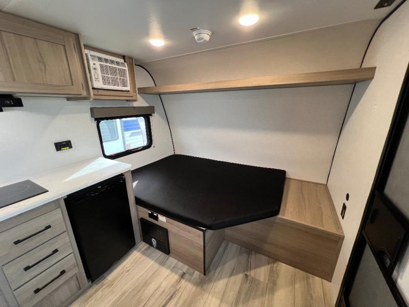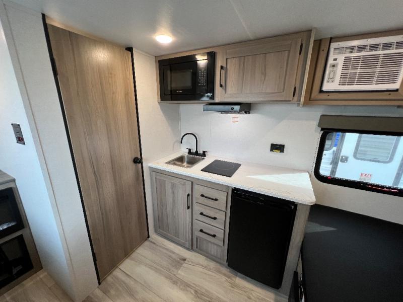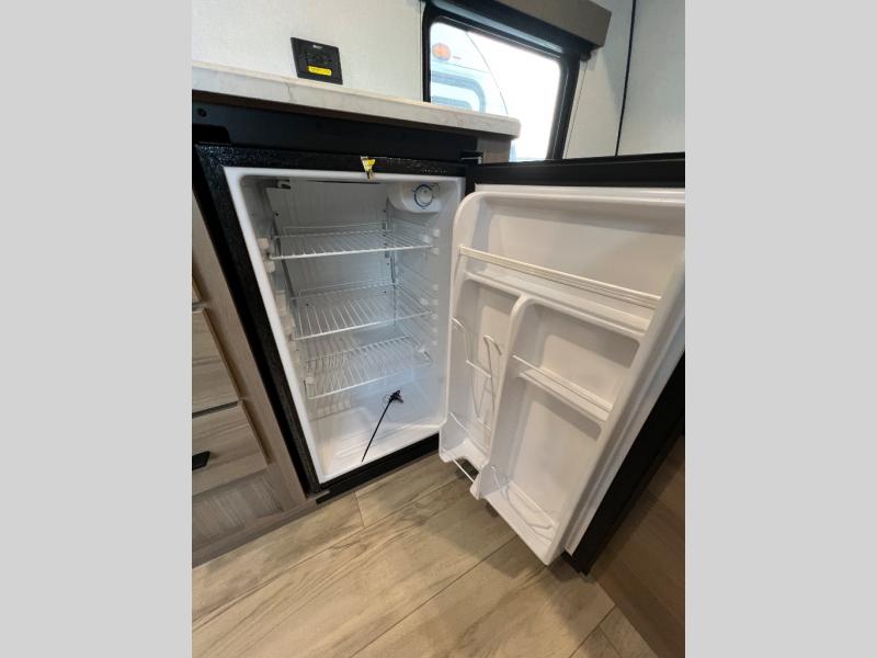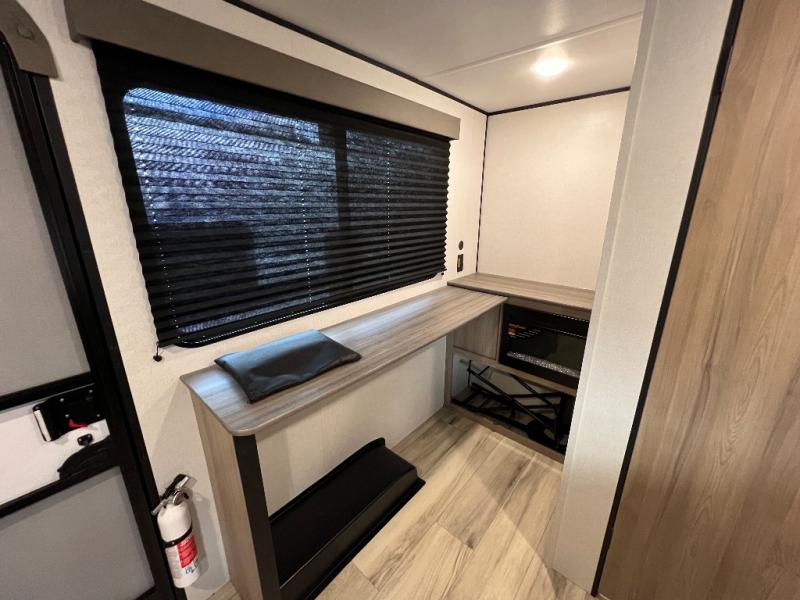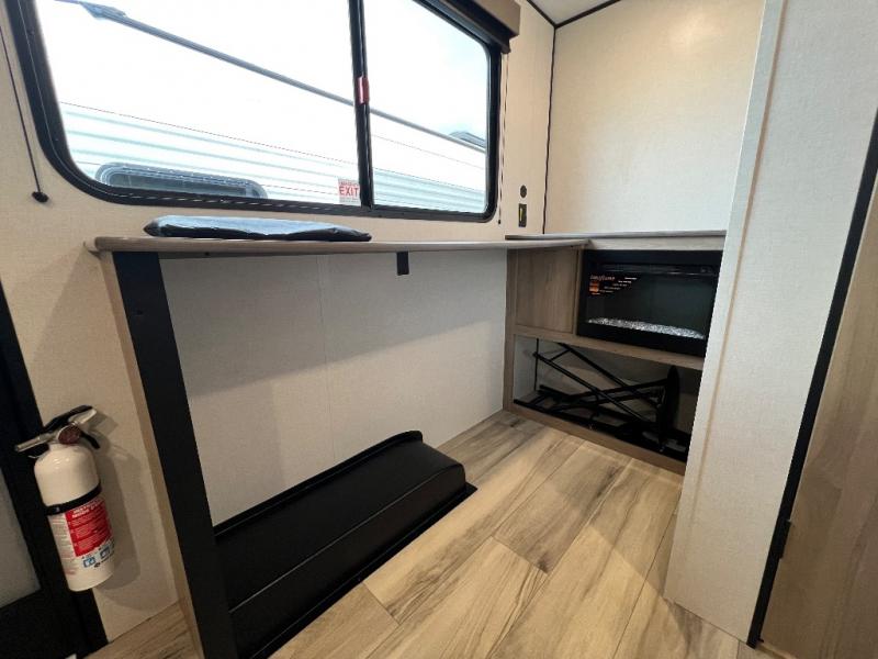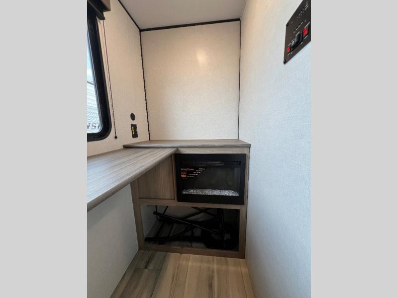 This travel trailer is perfect for a couple. The beautifully appointed bathroom is fully equipped for your needs, providing a serene space to unwind. The cozy fireplace creates a warm and welcoming atmosphere, perfect for relaxing with loved ones. The stylish bar with stools is great for socializing and enjoying meals. In the kitchen, the convenient microwave enables quick and easy meal preparation, while the spacious refrigerator keeps your food and drinks fresh. The ample overhead cabinets provide plenty of storage space, and the single burner cooktop gives you the freedom to cook your favorite homemade dishes. The plush queen bed is the perfect spot to rest and recharge, and the practical shelf provides additional storage for your favorite books, decorations, or personal items. The practical exterior features include a durable exterior awning that provides shade and protection from the elements, while the spacious exterior storage offers ample space for your outdoor gear and equipment.