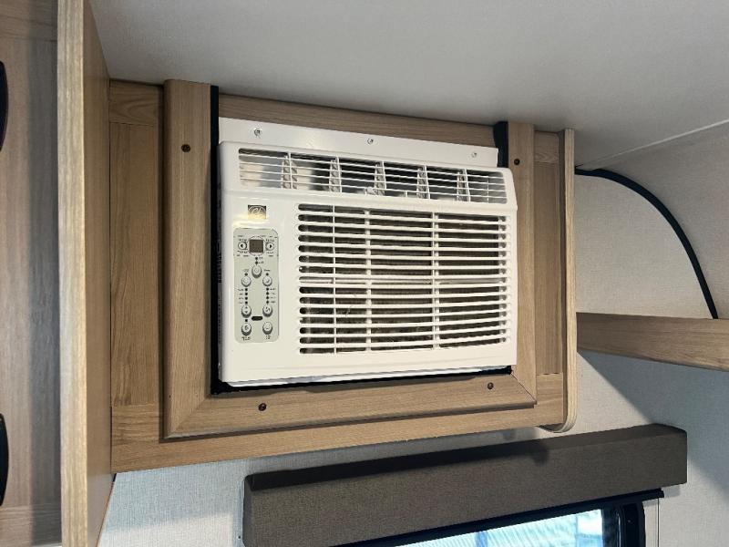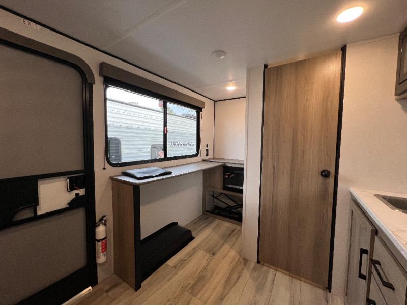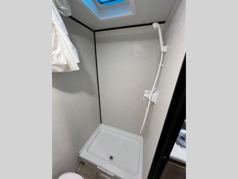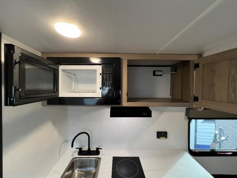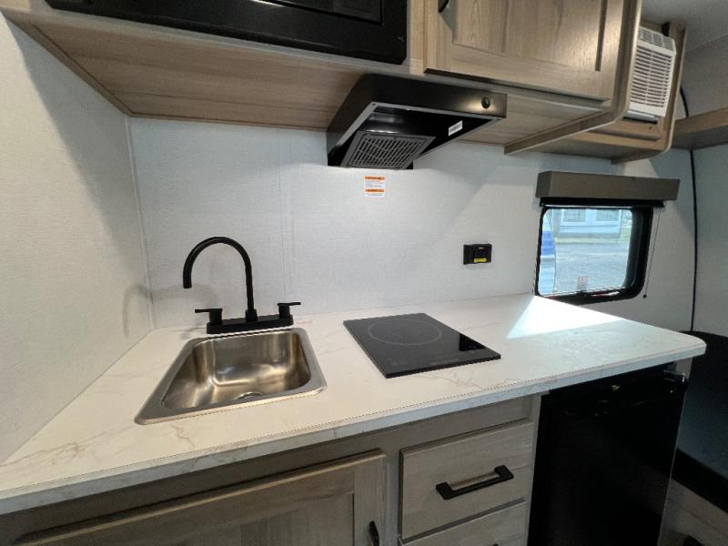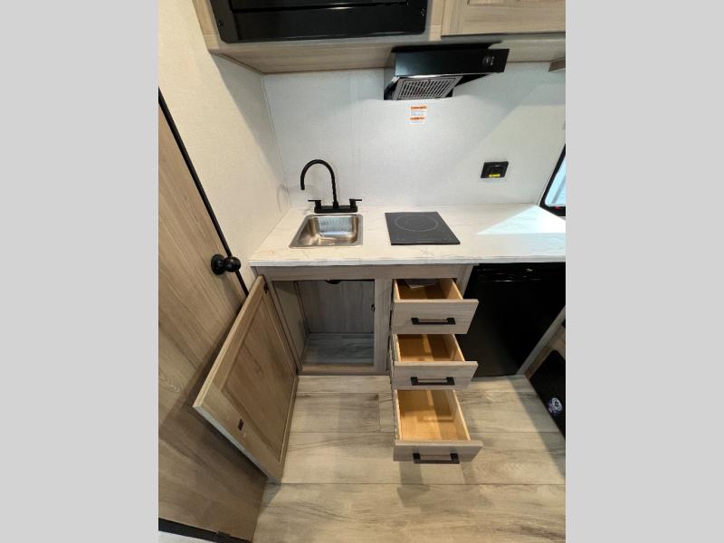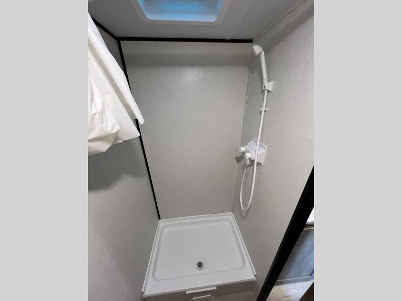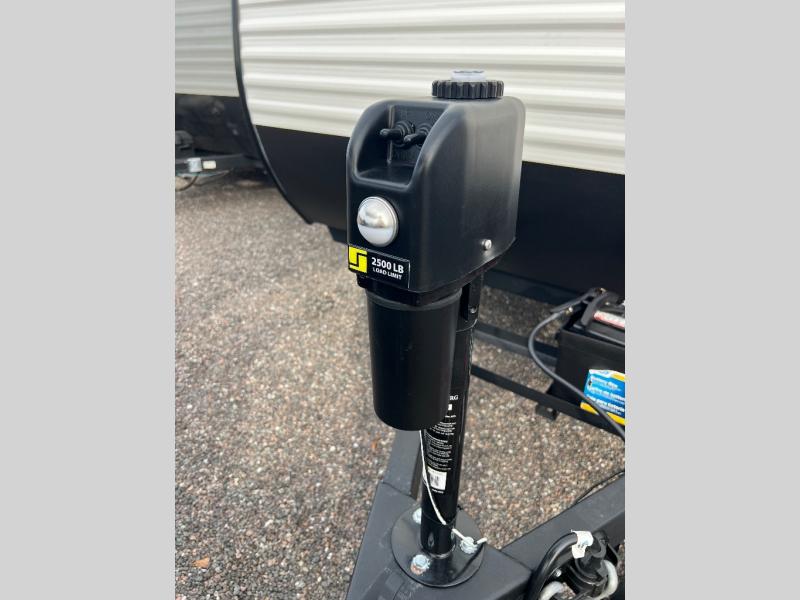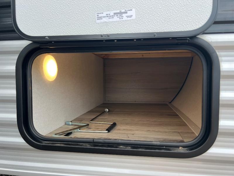 This travel trailer is perfect for a couple. The beautifully appointed bathroom is fully equipped for your needs, providing a serene space to unwind. The cozy fireplace creates a warm and welcoming atmosphere, perfect for relaxing with loved ones. The stylish bar with stools is great for socializing and enjoying meals. In the kitchen, the convenient microwave enables quick and easy meal preparation, while the spacious refrigerator keeps your food and drinks fresh. The ample overhead cabinets provide plenty of storage space, and the single burner cooktop gives you the freedom to cook your favorite homemade dishes. The plush queen bed is the perfect spot to rest and recharge, and the practical shelf provides additional storage for your favorite books, decorations, or personal items. The practical exterior features include a durable exterior awning that provides shade and protection from the elements, while the spacious exterior storage offers ample space for your outdoor gear and equipment.