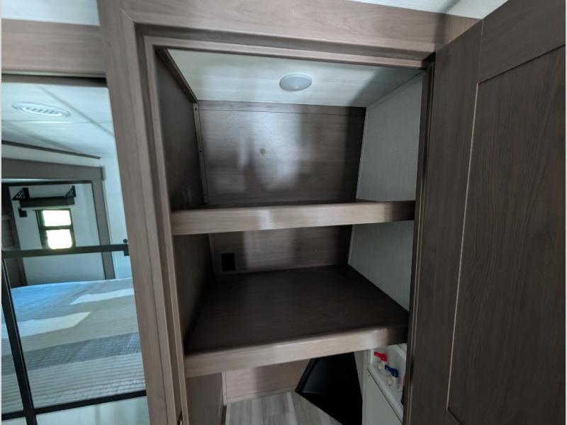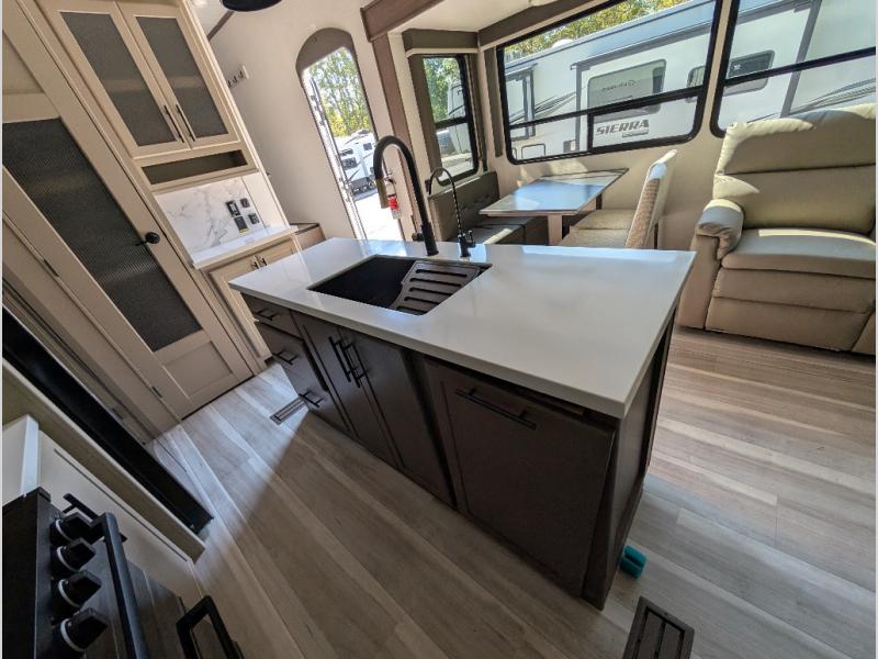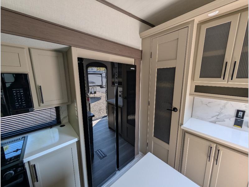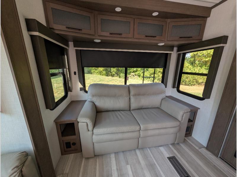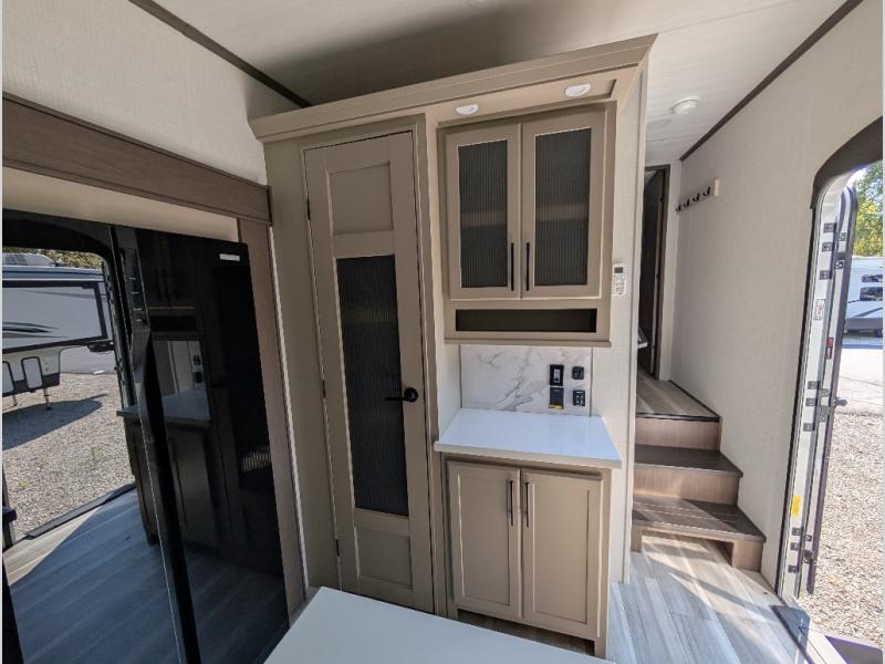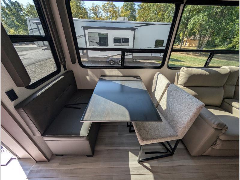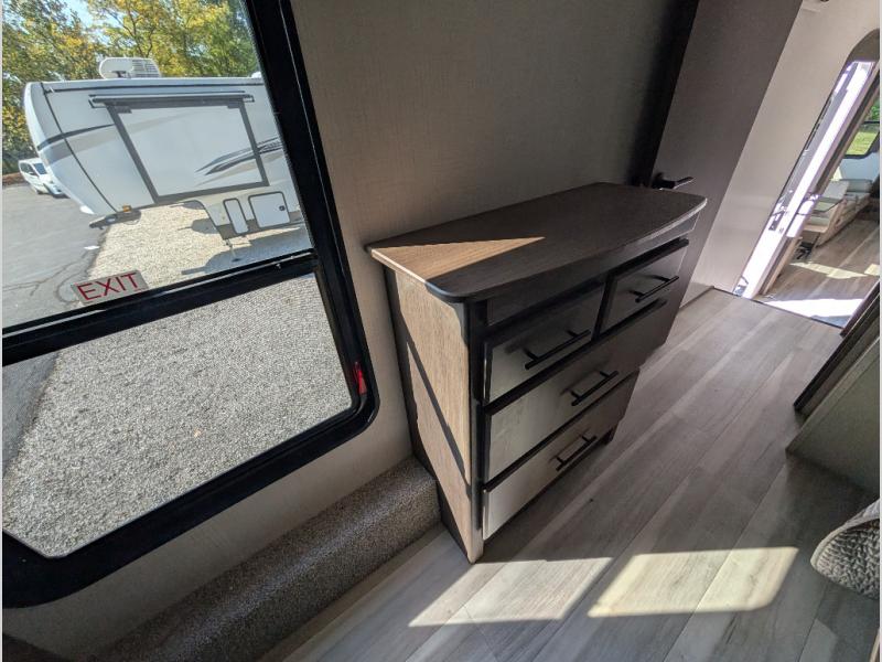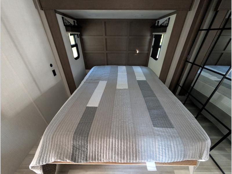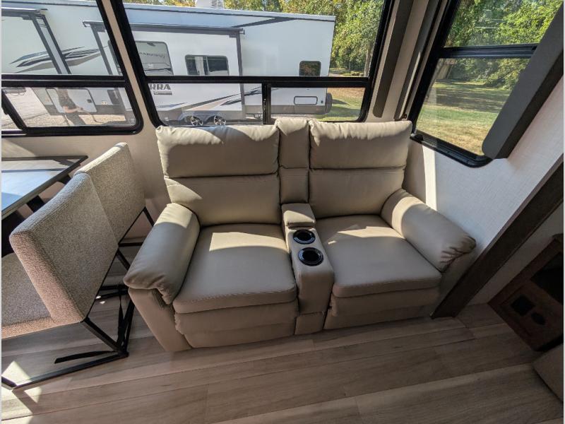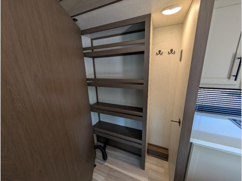 The dual opposing slides in the combined kitchen and living area will give you an open floorplan! You'll sleep on the queen-size bed in the front private bedroom, and there is under-bed storage, a full-height wardrobe, and a dresser with hidden storage for all of your personal belongings. As you spend time in the main living area, you'll appreciate having extra space thanks to the set of opposing slides, and the kitchen island will be easy to work around. You'll be able to relax on the tri-fold sleeper sofa and theater seating while you watch the LED HDTV with an pivoting entertainment door and hidden pantry. There is also a booth dinette with storage drawers, convenient shoe storage right as you enter the unit, and an exterior unobstructed pass-thru storage so nothing gets left behind.
