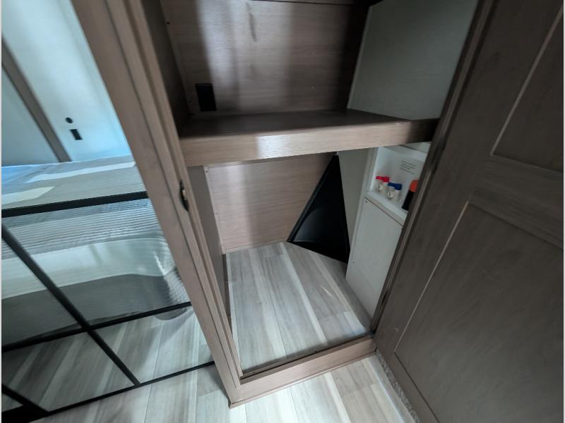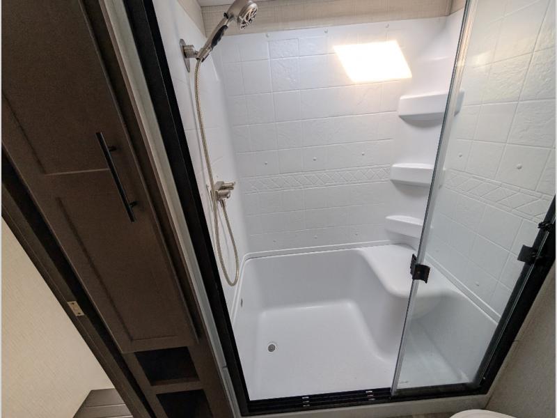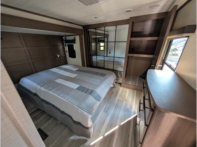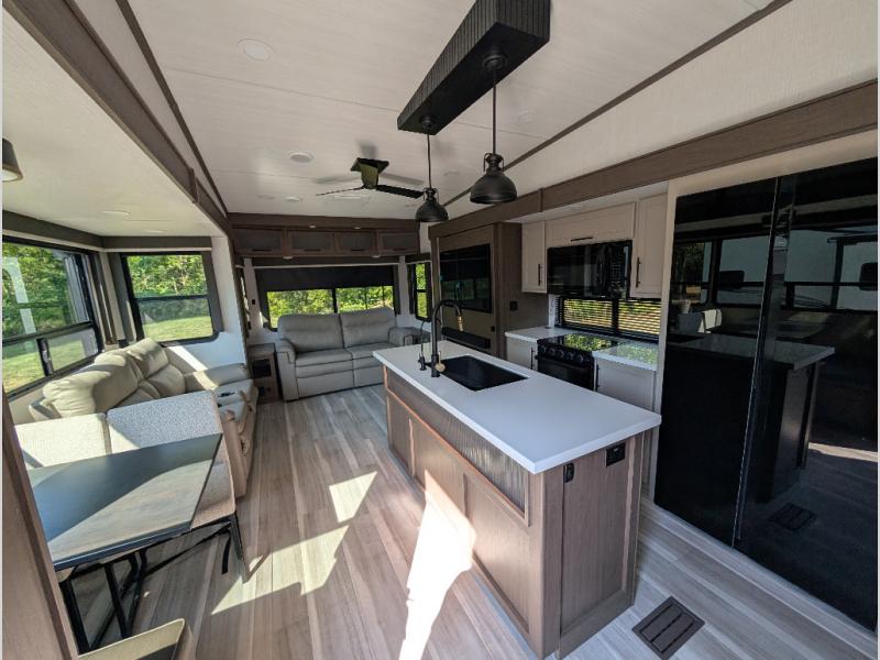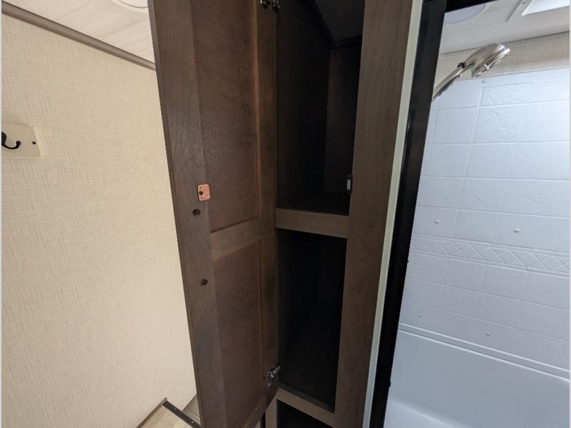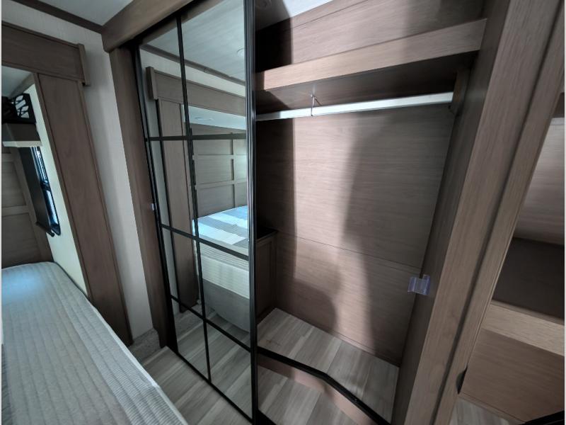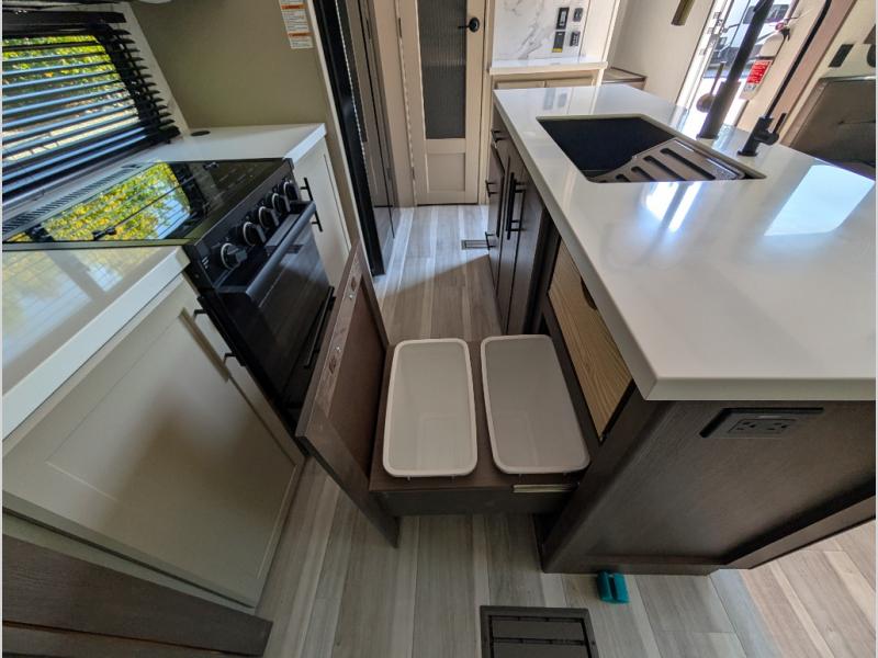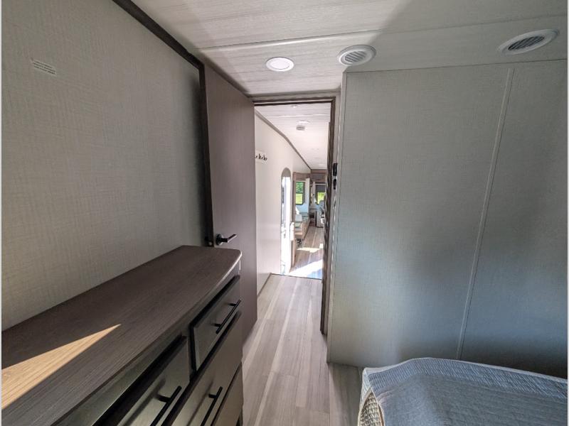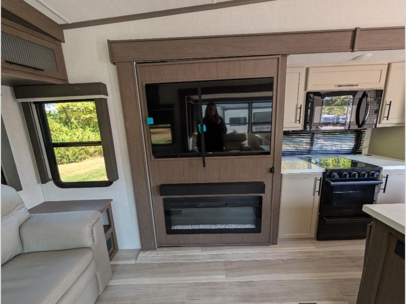 The dual opposing slides in the combined kitchen and living area will give you an open floorplan! You'll sleep on the queen-size bed in the front private bedroom, and there is under-bed storage, a full-height wardrobe, and a dresser with hidden storage for all of your personal belongings. As you spend time in the main living area, you'll appreciate having extra space thanks to the set of opposing slides, and the kitchen island will be easy to work around. You'll be able to relax on the tri-fold sleeper sofa and theater seating while you watch the LED HDTV with an pivoting entertainment door and hidden pantry. There is also a booth dinette with storage drawers, convenient shoe storage right as you enter the unit, and an exterior unobstructed pass-thru storage so nothing gets left behind.
