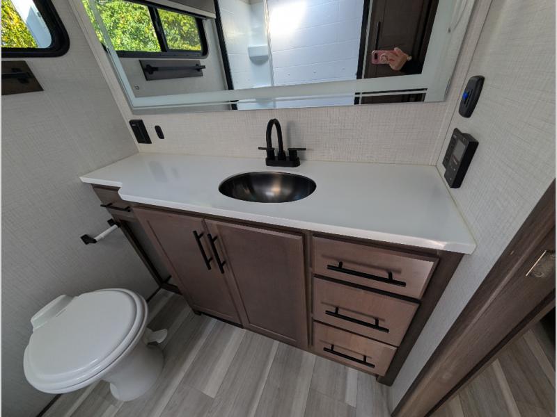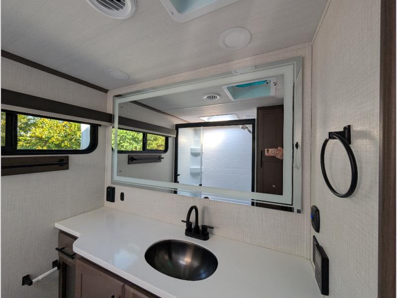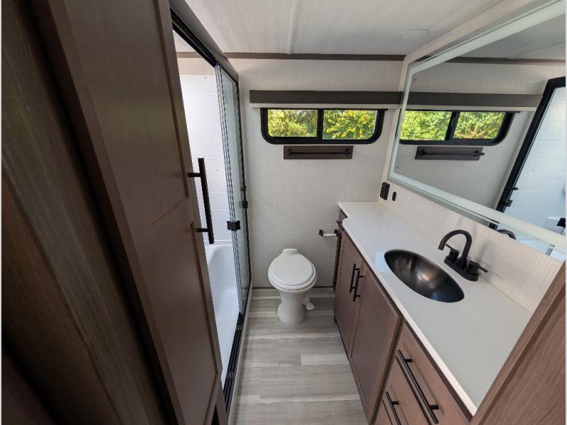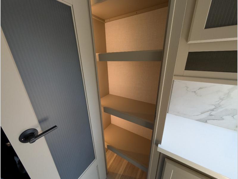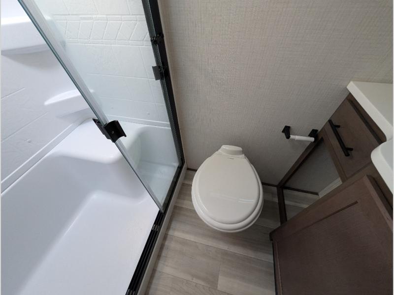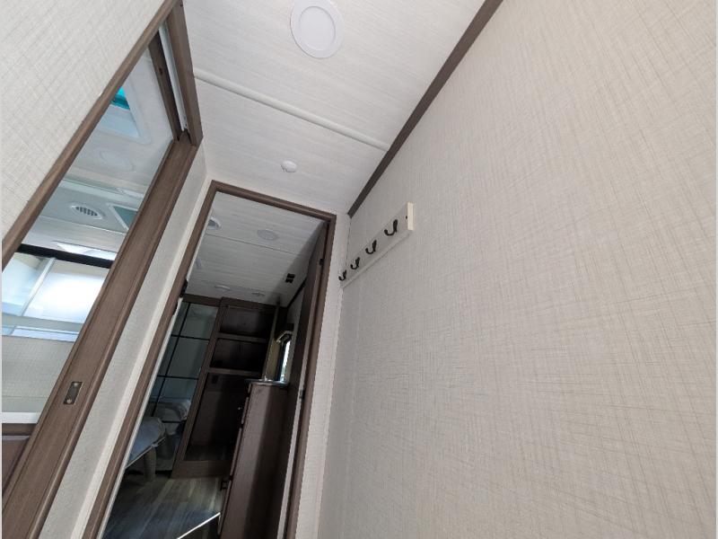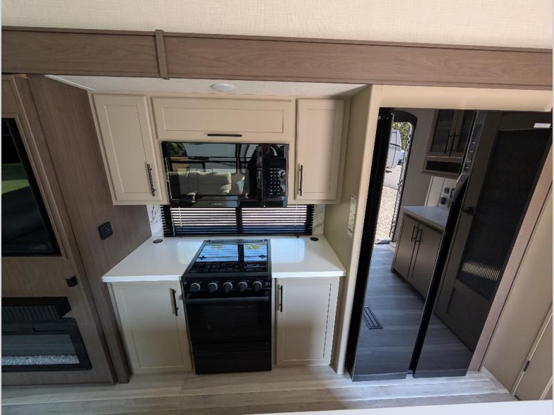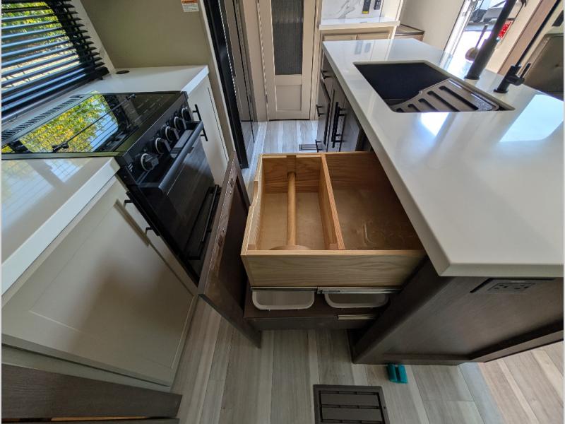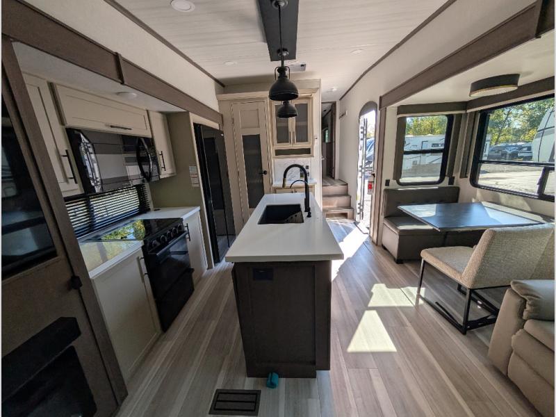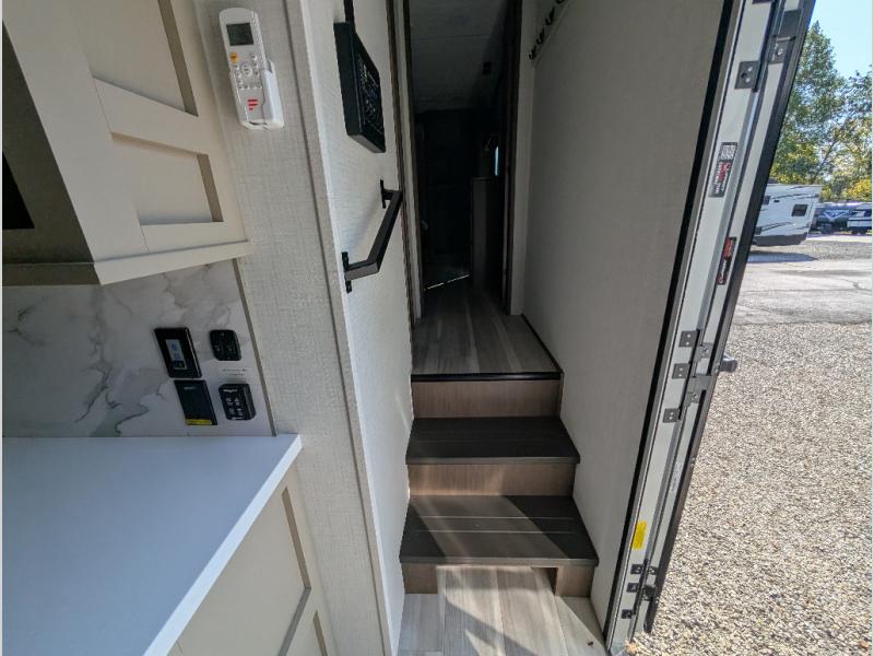 The dual opposing slides in the combined kitchen and living area will give you an open floorplan! You'll sleep on the queen-size bed in the front private bedroom, and there is under-bed storage, a full-height wardrobe, and a dresser with hidden storage for all of your personal belongings. As you spend time in the main living area, you'll appreciate having extra space thanks to the set of opposing slides, and the kitchen island will be easy to work around. You'll be able to relax on the tri-fold sleeper sofa and theater seating while you watch the LED HDTV with an pivoting entertainment door and hidden pantry. There is also a booth dinette with storage drawers, convenient shoe storage right as you enter the unit, and an exterior unobstructed pass-thru storage so nothing gets left behind.