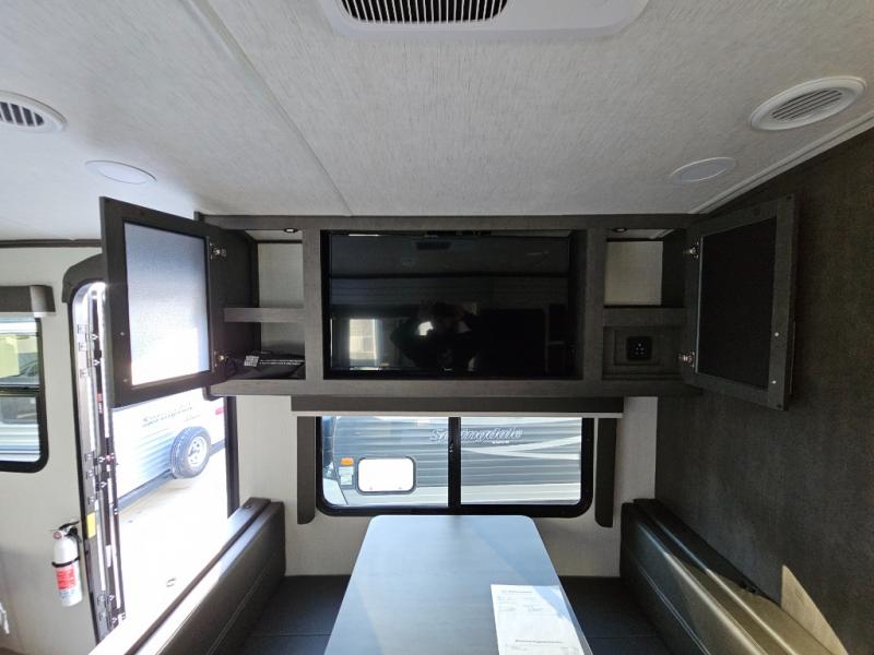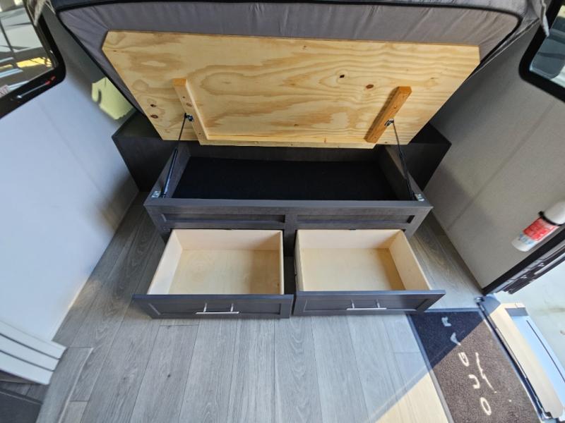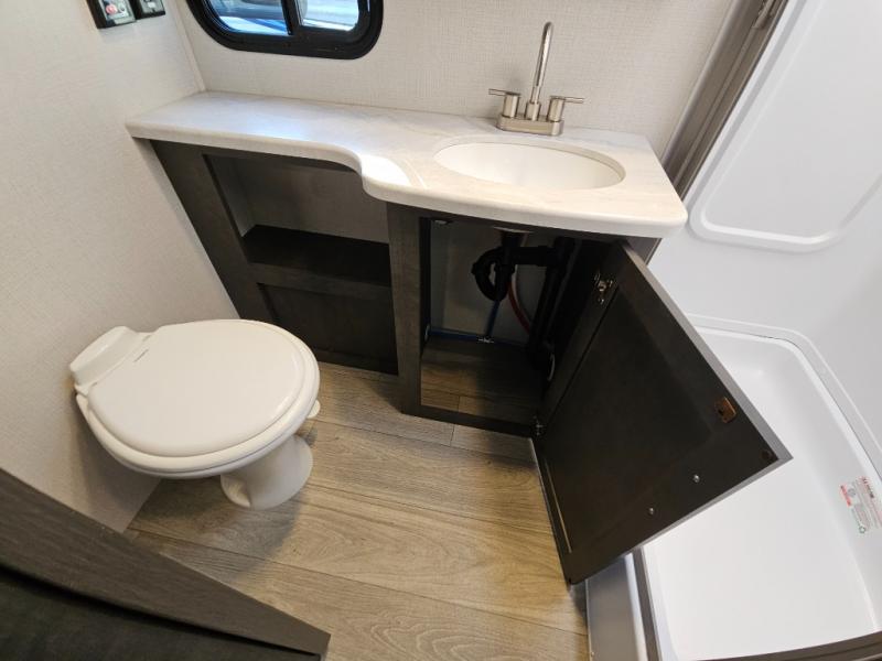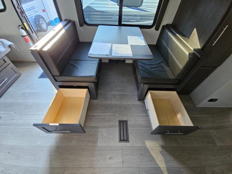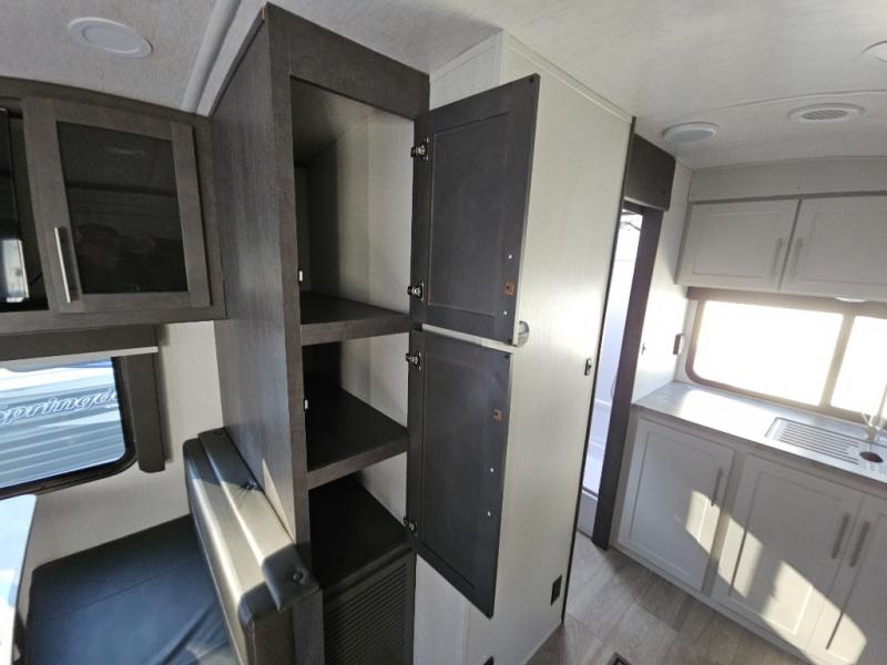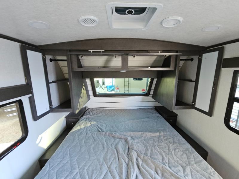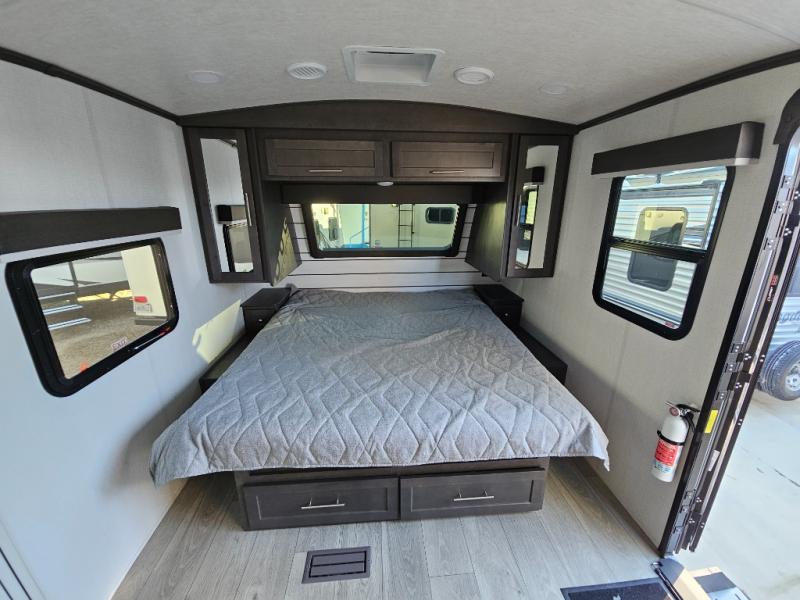 With a king-size bed, this Cougar Half-Ton travel trailer shows that you can still be comfortable even while you're away from home! The bed has drawers and nightstands on either side to keep your belongings tidy. Right next to the booth dinette is the pantry, and next to the pantry is the full bathroom which is certainly one of the most valuable features to any trailer.