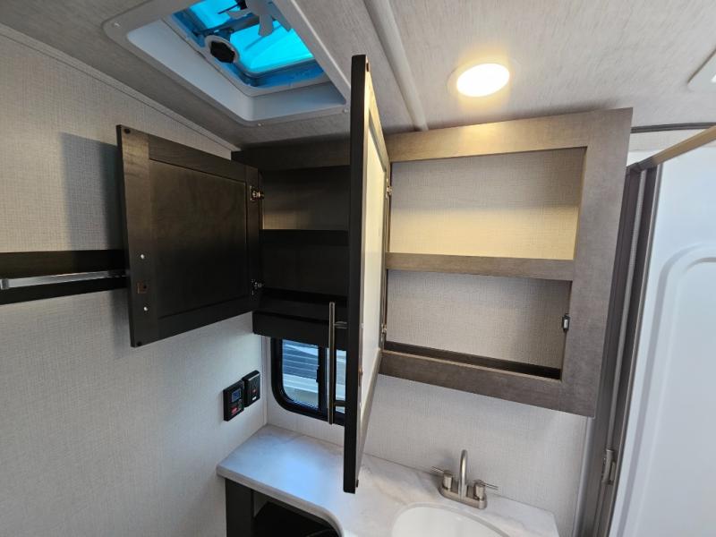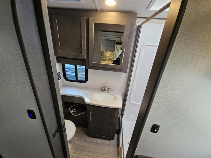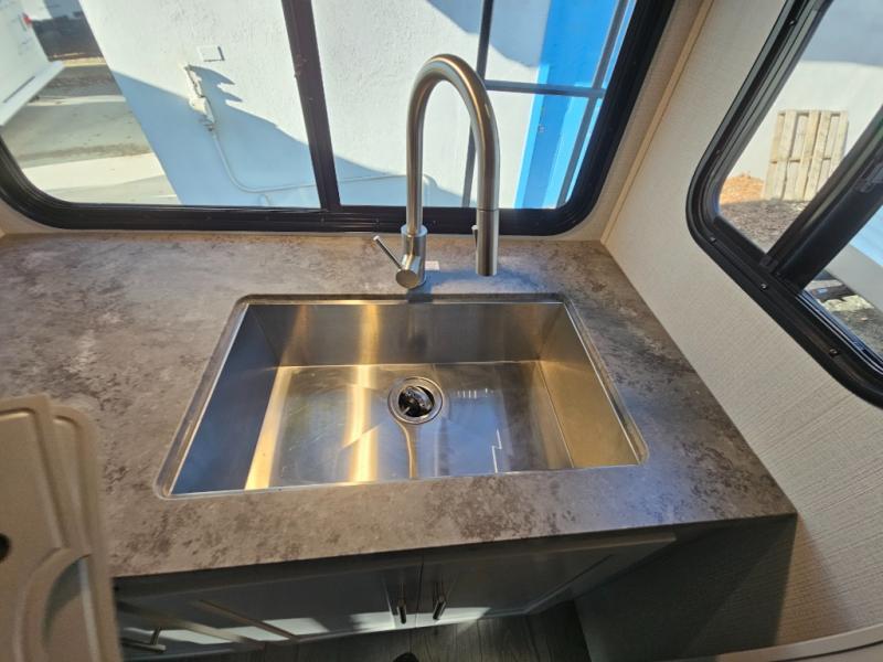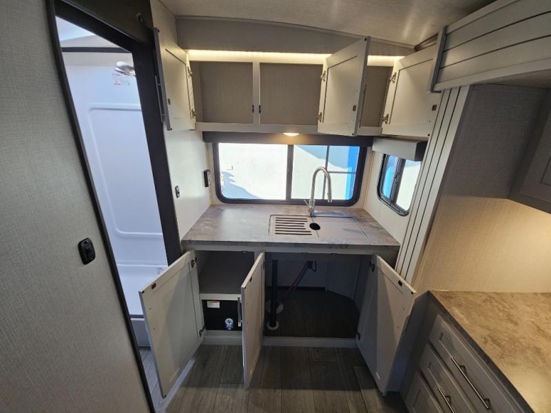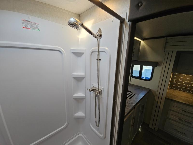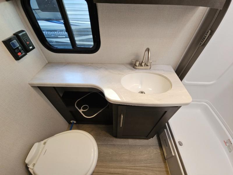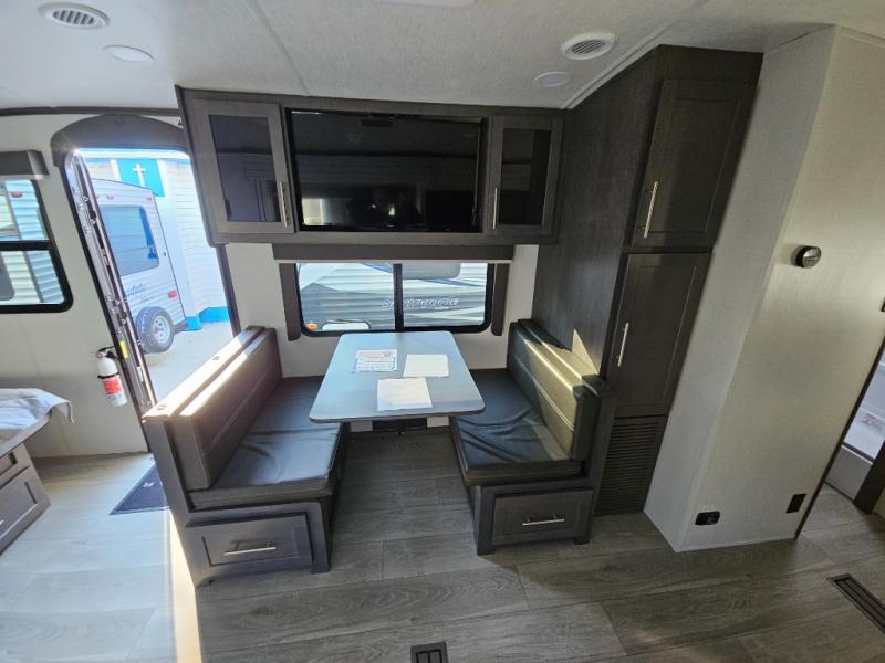 With a king-size bed, this Cougar Half-Ton travel trailer shows that you can still be comfortable even while you're away from home! The bed has drawers and nightstands on either side to keep your belongings tidy. Right next to the booth dinette is the pantry, and next to the pantry is the full bathroom which is certainly one of the most valuable features to any trailer.