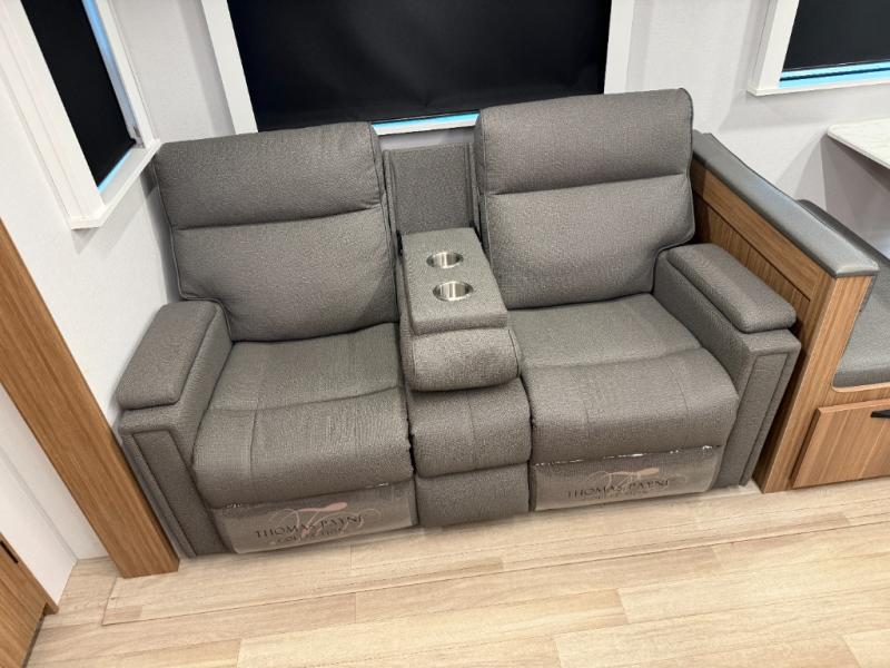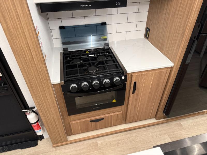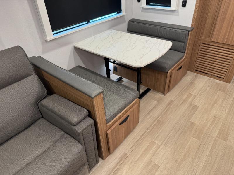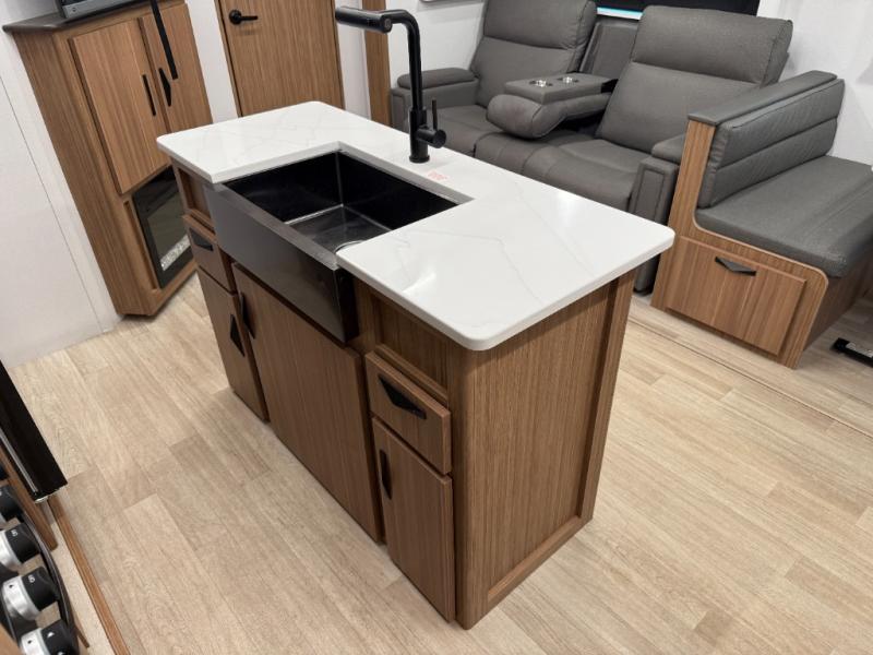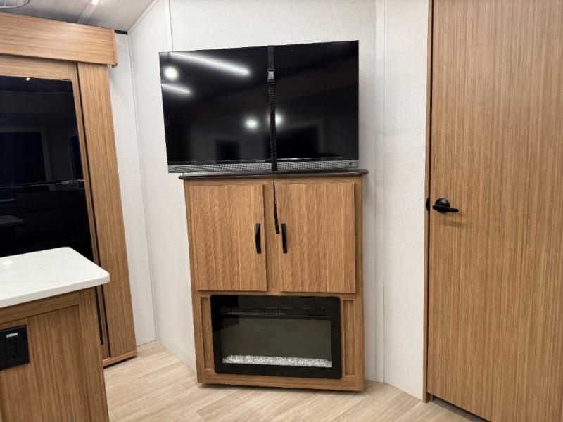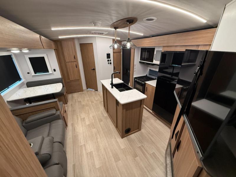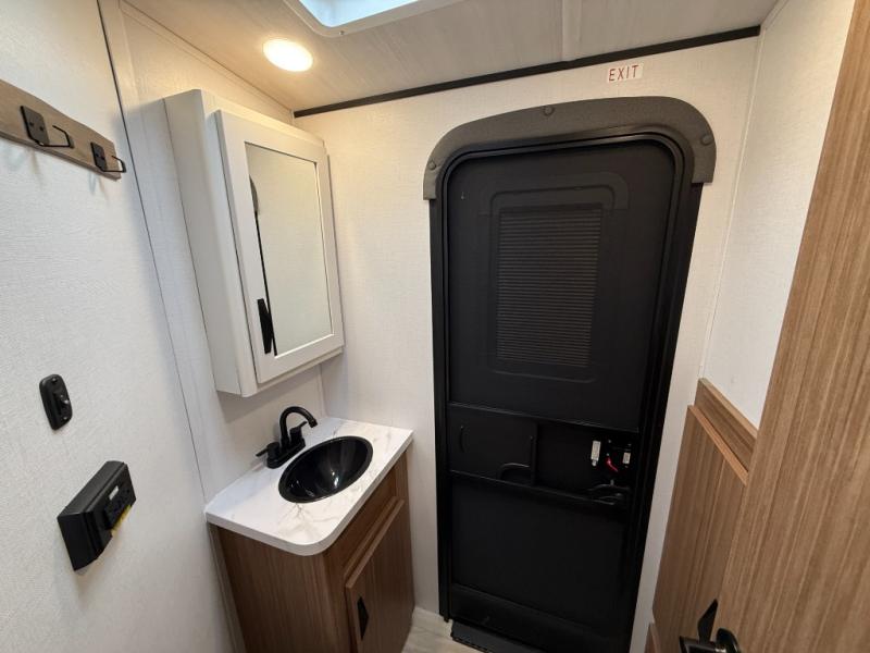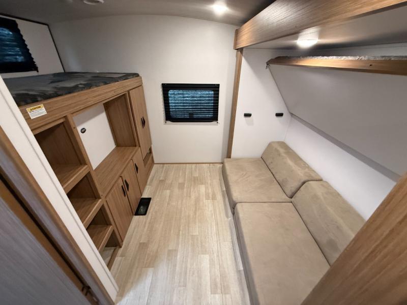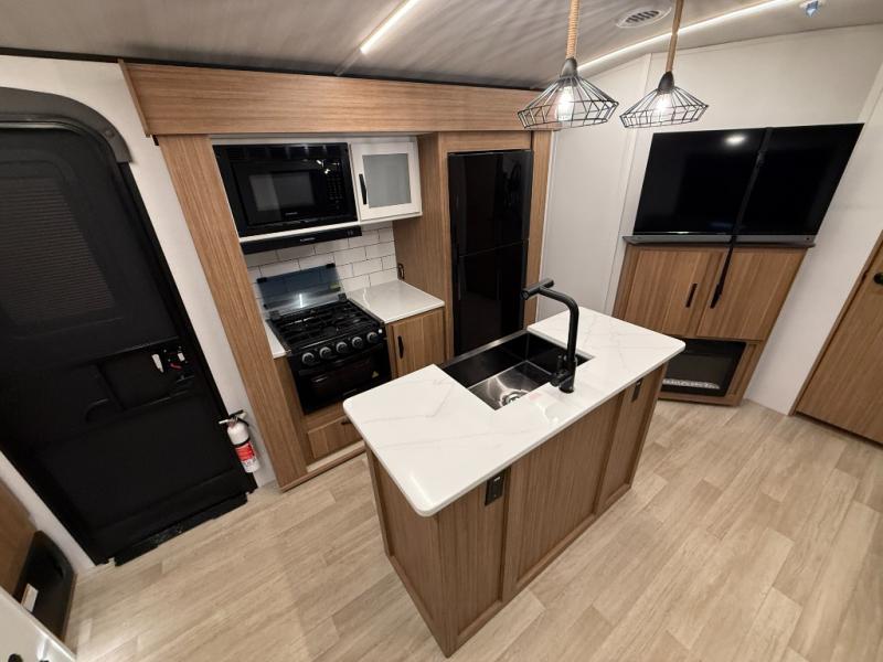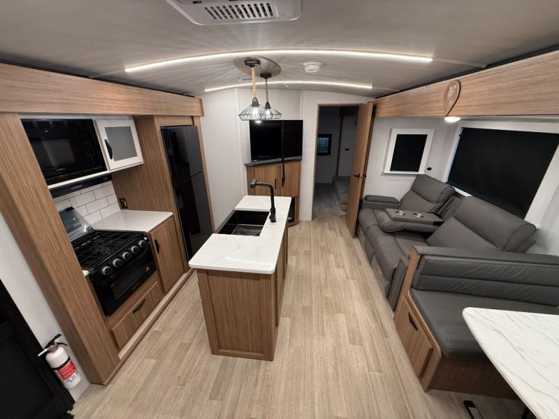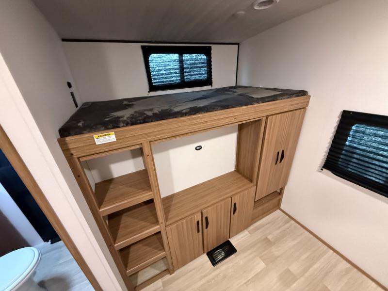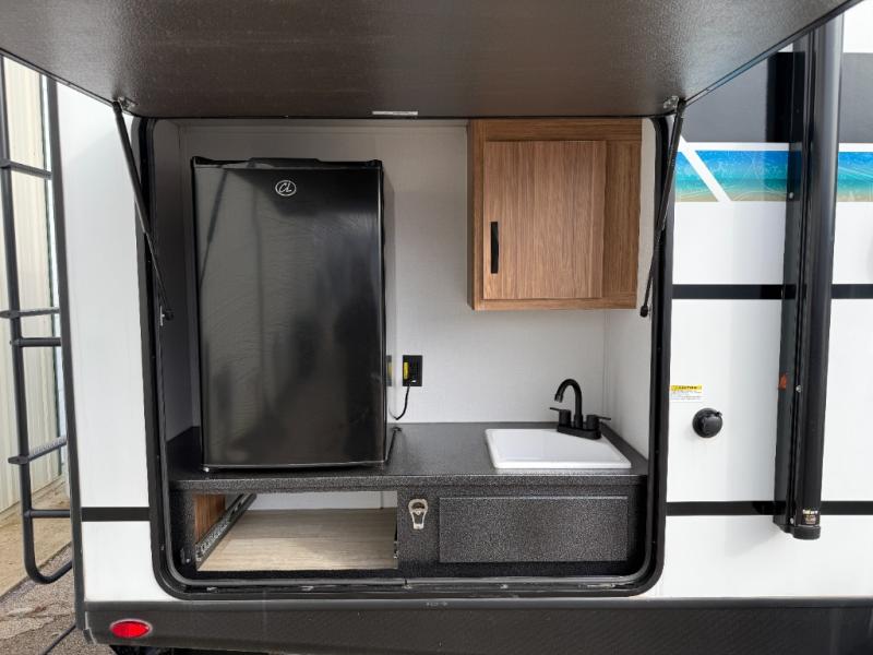You won't believe all that this travel trailer has to offer! Starting with the rear private bunkhouse which has a 28" x 74" flip-up bunk above a tri-fold sofa, a 51" x 74" bunk above an entertainment center, and even a half bathroom which has one of the dual entry doors to the unit. The front private bedroom has a queen bed to lay your head on at night with wardrobes on either side. As you exit the bedroom, you will enter the walk-through bathroom. Now that you're ready for the day, you can head to the fully equipped kitchen complete with a kitchen island to whip up some delicious cinnamon rolls that can be enjoyed at the Do-More dinette table. You even have an outside kitchen with a griddle, sink, and mini-fridge!