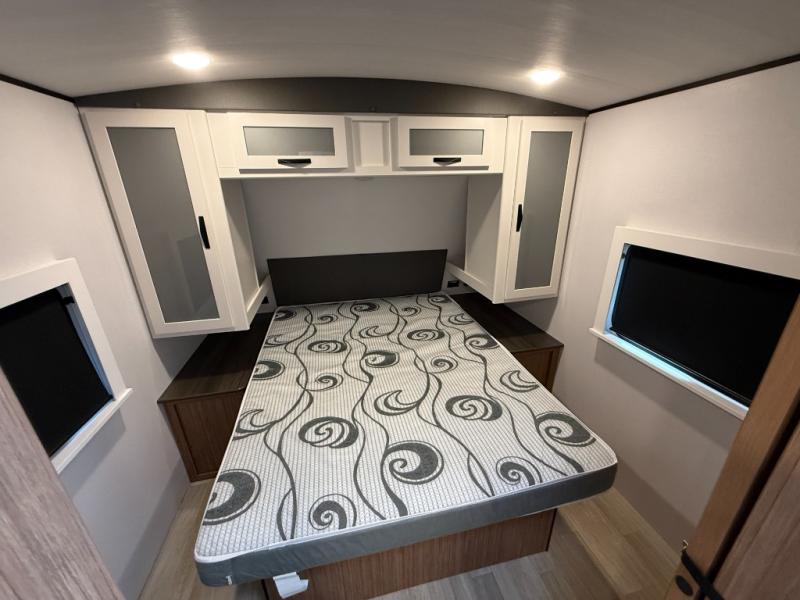 Each one of these Keystone RV Passport travel trailers offer grand style and multi-functional features! They have best-in-class storage for big things like paddle boards and small things like sleeping bags. There's no need for cordless drills and bending over to put the jacks down, simply push a button and the power stabilizer jacks do the rest. The heated and enclosed underbelly helps protect your unit's vitals in different weather conditions. Exclusive to Keystone is the Beauflor® vinyl flooring which is more resilient, stronger and lighter than the traditional laminated wood construction, plus it resists water and water damage. Inside, you'll find residential durable Cedar frost interior decor, LED lights throughout, decorative bedspread, and a skylight for more natural light.