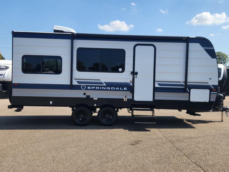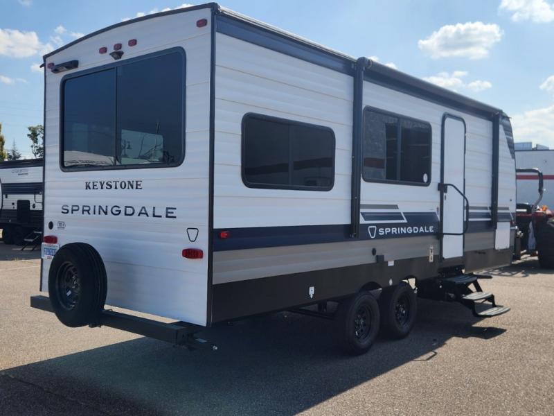 The Springdale Classic travel trailers by Keystone will provide you and your family many great outdoor experiences and it will also be kind to your pocketbook. Each one is constructed with a walkable roof and an I-beam frame with stamped steel cross-members and outriggers for added strength. There are also heavy-duty stabilizer jacks and power tongue jacks outside, along with an XL entry assist handle for added convenience. Each travel trailer includes LED lighting, bedside outlets, and blackout night shades inside that will provide you with more privacy at night.