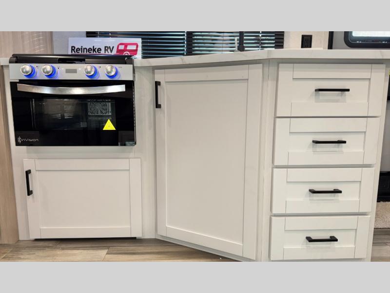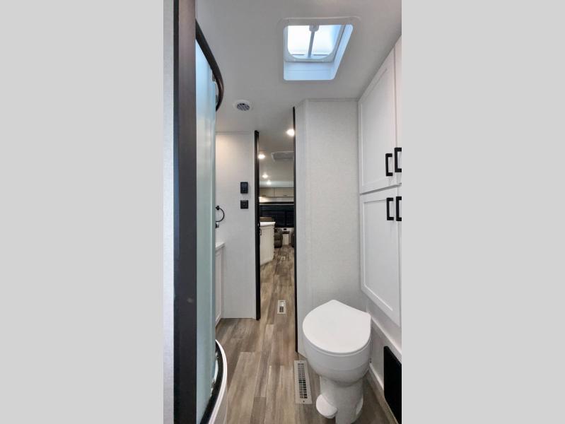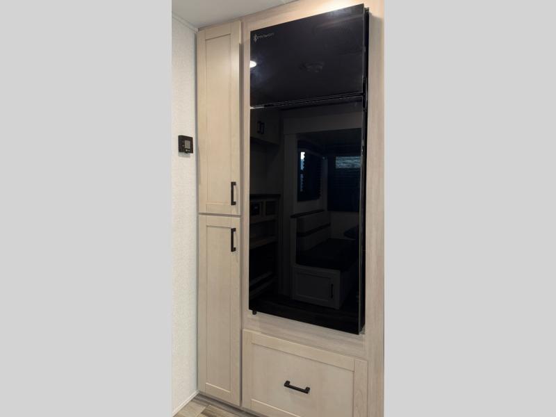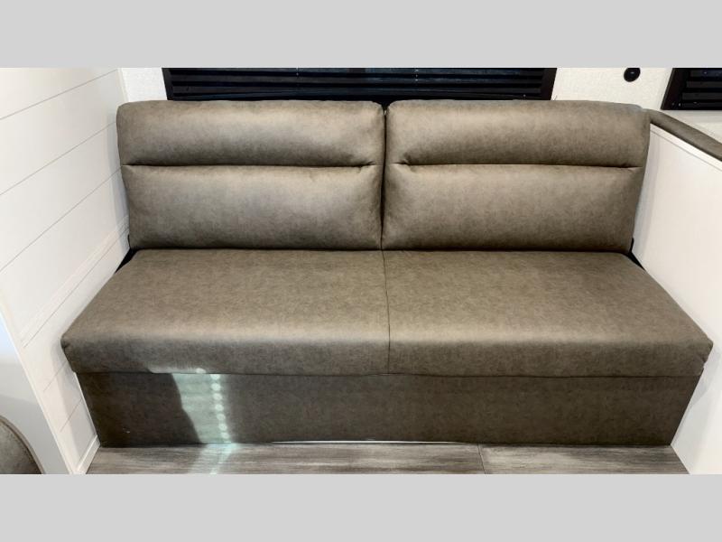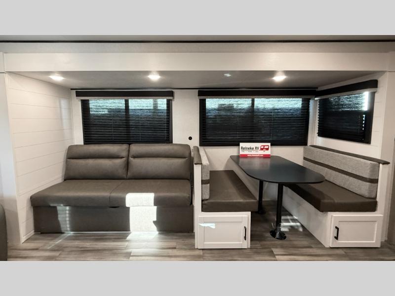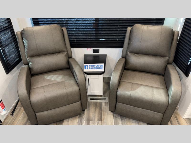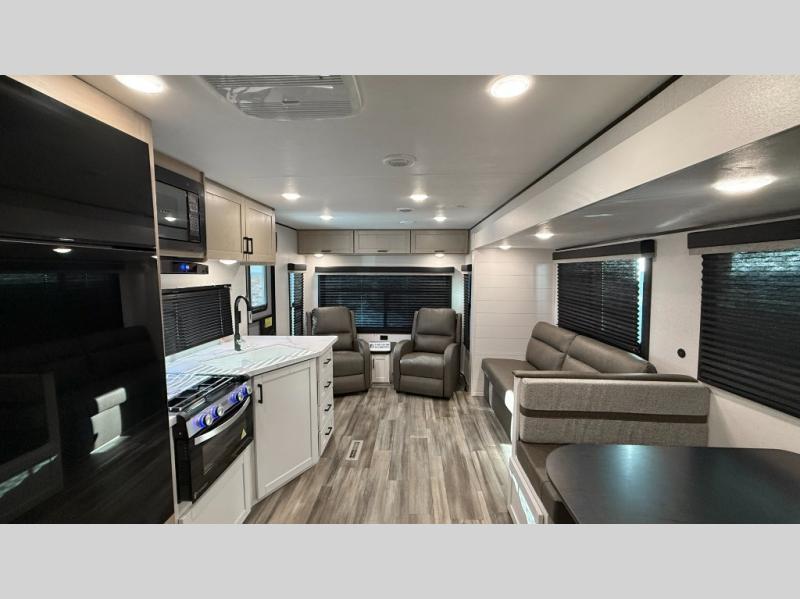 With dual entry doors in this unit, you can enter in through the front master bedroom or the rear living room! The dual lounge chairs in the back will let you relax with a book and your coffee, and there is a large slide out with a jack-knife sofa and booth dinette for additional seating spaces. The chef of your group can make meals on the three-burner cooktop or in the microwave oven, and there is a pantry for dry goods or snacks. The walk-thru bath is easily accessible for everyone to use, and the front master bedroom with a 60" x 74" RV queen bed will make you feel right at home!
