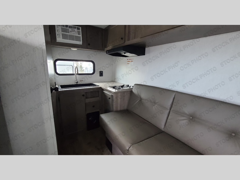 You'll love camping in this cozy trailer! Once you arrive at the campground, you can set up the 9' power awning and head inside to unpack your bags. After you've stretched your legs on a hike, the rear corner private bath with a 24" x 32" shower and a toilet will let you freshen up. You'll find the kitchen in the other rear corner, complete with a two burner cooktop, a double sink, plus counter space to prep meals. When you're ready for some shut-eye, the front 54" x 74" full-size bed will provide a great night's rest, while your guest takes the 56" jiffy sofa!