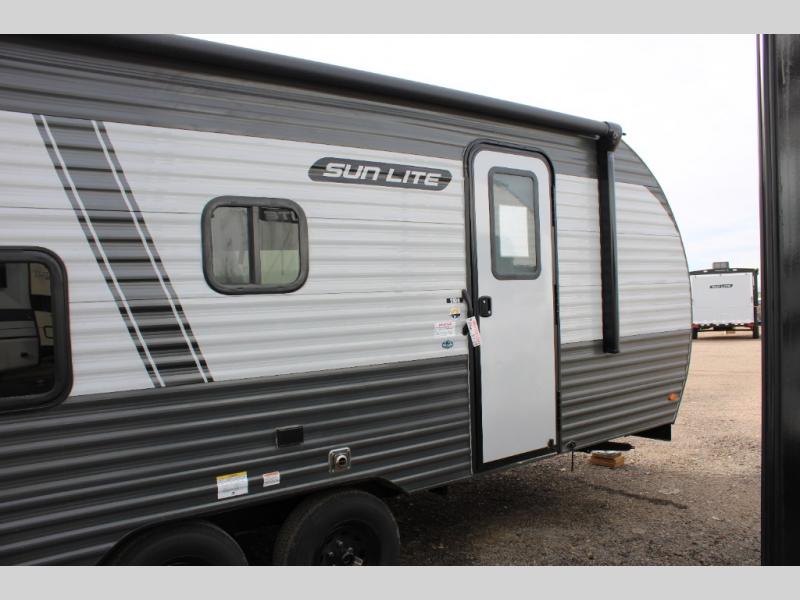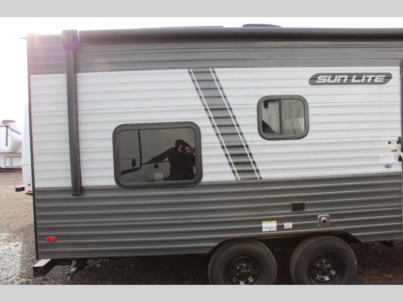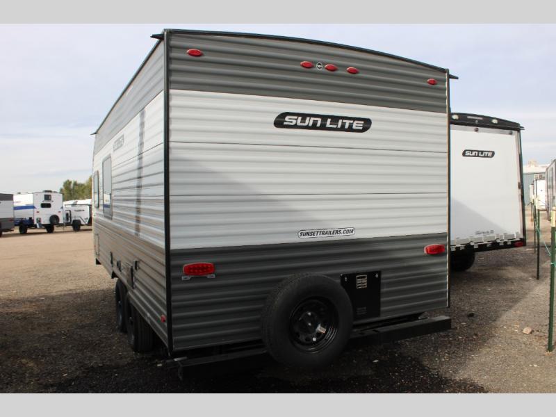 Each Sun Lite LTD travel trailer by Sunset Park RV is made with flexibility in mind. These lightweight models weigh under 3,000 lbs. for easy towing, and they offer best-in class interior storage for all your belongings. They are built with a one-piece PVC roof membrane and a durable rock guard that will help protect against rock and debris on the way to the campground. There is also an electric awning outside, along with a 100-watt solar kit, an outside shower, and more convenient features. You'll find a power roof vent in the bath, stylish window treatments, ball bearing drawer guides, and LED lights to name a few interior comforts.