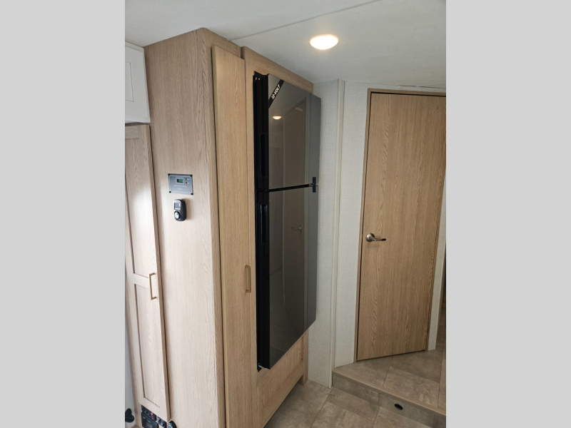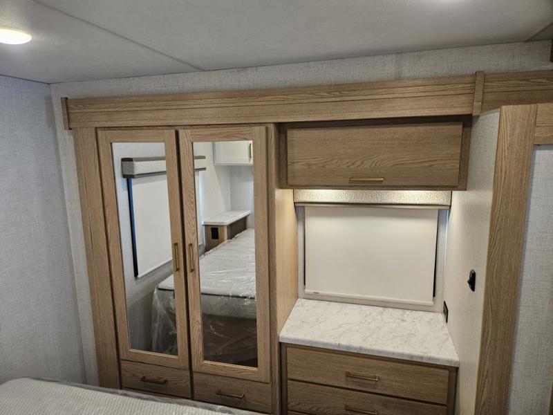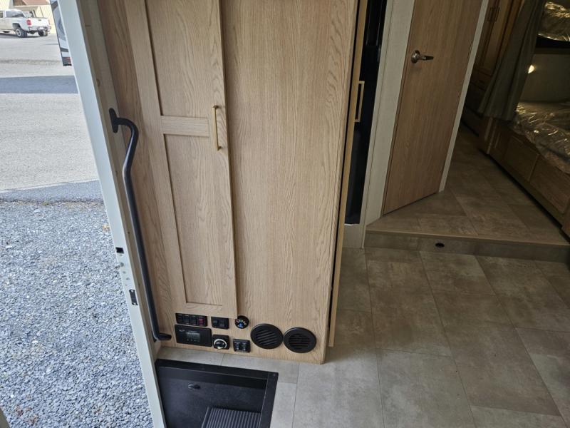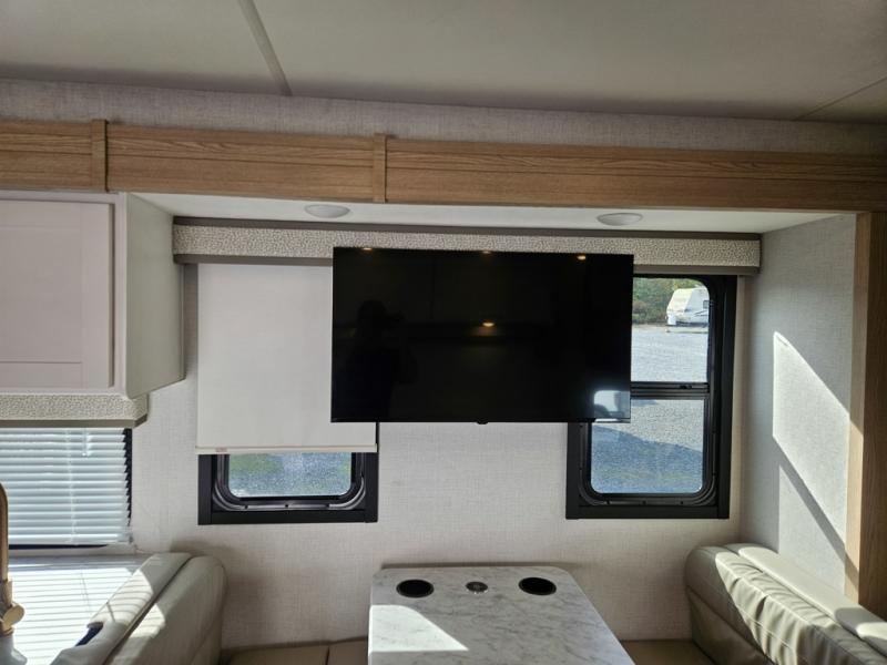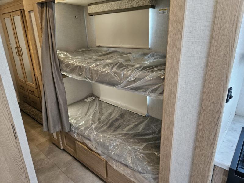 Planning a family vacation, a friend get-away or enjoy traveling with your partner? This coach offers a spacious interior thanks to the full-wall slide that stretches from behind the cab seats to the rear private bedroom. You can rest easy in your own queen bed with access to the double entry bathroom, your kids or guests will enjoy the bunk beds and cab over bunk to sleep on, plus the 71" Dream Dinette and 68" jack-knife sofa offer even more sleeping space. And the kitchen amenities will impress anyone as they enter the mid-coach entrance. Everyone can watch the 40" mid-ship Smart TV in the living area, or head outside to relax under the power awning with integrated LED lighting. There is even an optional exterior TV if you want to watch the big game outdoors!