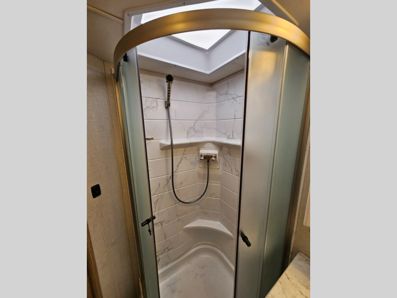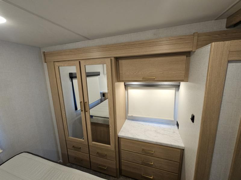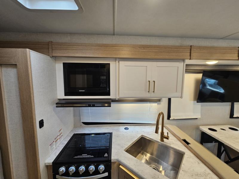 Planning a family vacation, a friend get-away or enjoy traveling with your partner? This coach offers a spacious interior thanks to the full-wall slide that stretches from behind the cab seats to the rear private bedroom. You can rest easy in your own queen bed with access to the double entry bathroom, your kids or guests will enjoy the bunk beds and cab over bunk to sleep on, plus the 71" Dream Dinette and 68" jack-knife sofa offer even more sleeping space. And the kitchen amenities will impress anyone as they enter the mid-coach entrance. Everyone can watch the 40" mid-ship Smart TV in the living area, or head outside to relax under the power awning with integrated LED lighting. There is even an optional exterior TV if you want to watch the big game outdoors!