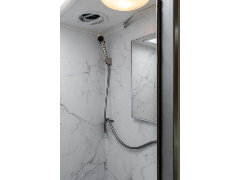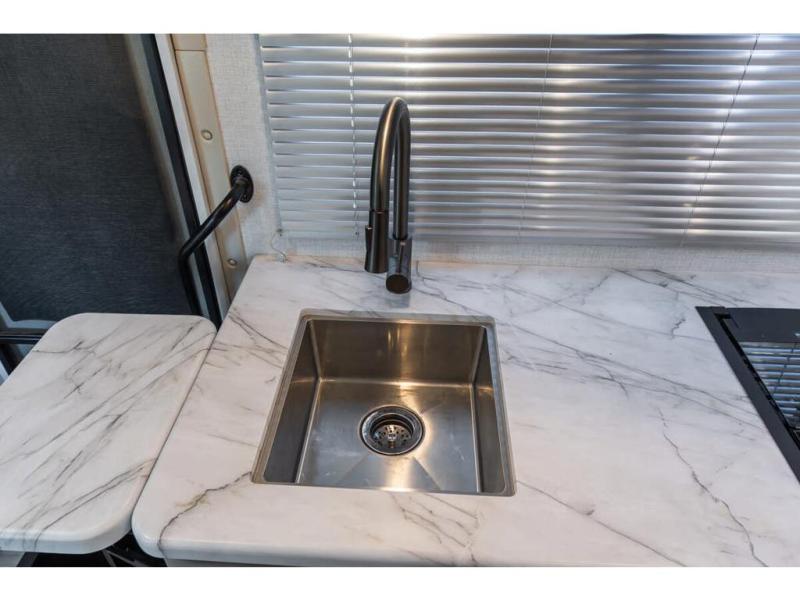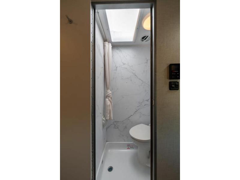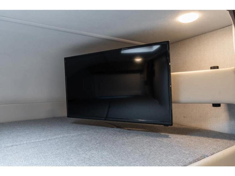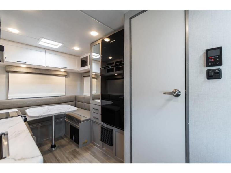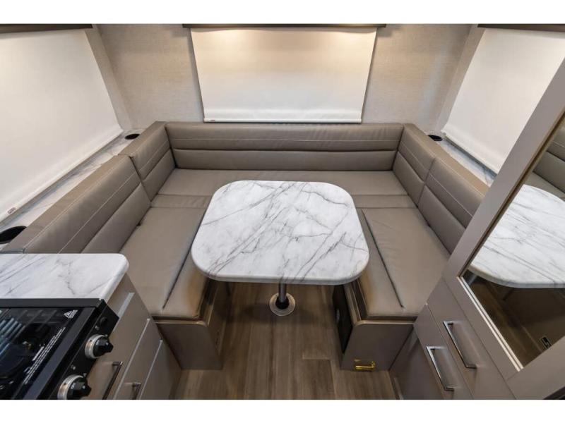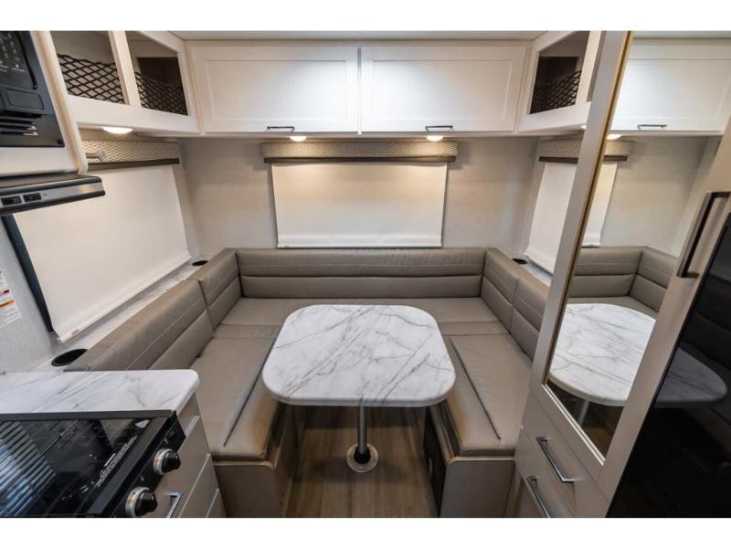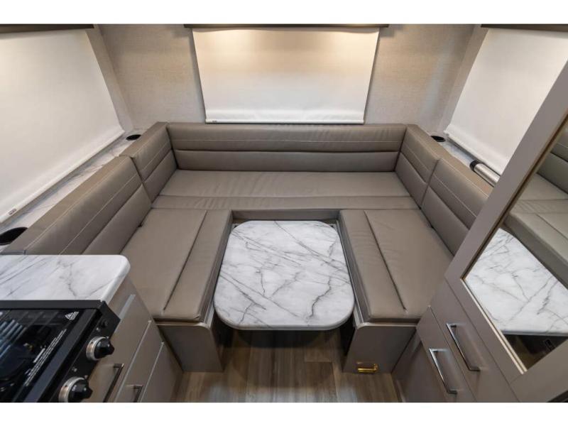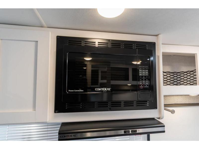 This cozy coach is perfect for three to four happy campers! Once you stop for the day, you can freshen up in the wet bath that includes a foot flush toilet, power vent, and shower skylight for more natural lighting. The two burner cooktop and convection microwave with an air fryer will let you make meals each day, and the 12V refrigerator will keep your food fresh. You'll also appreciate the flip-up countertop for more space to prep meals. There is a U-shaped dinette with a removable table that will convert to a 54" x 77" bed, while the little ones take the cab-over bunk with a 52" x 91" sleeping area.