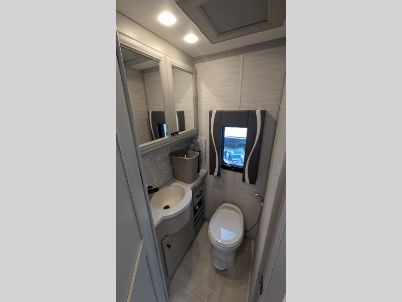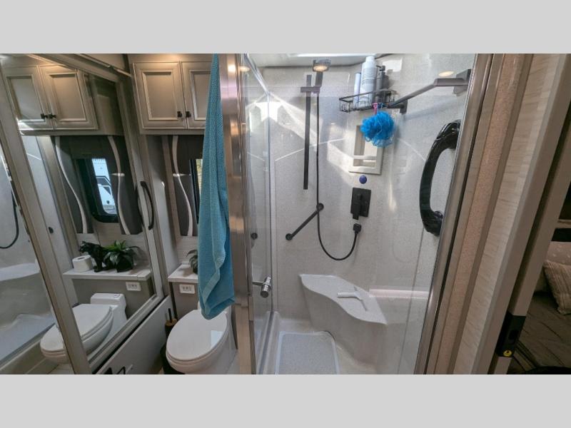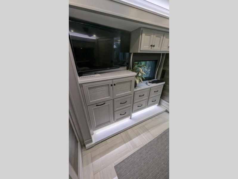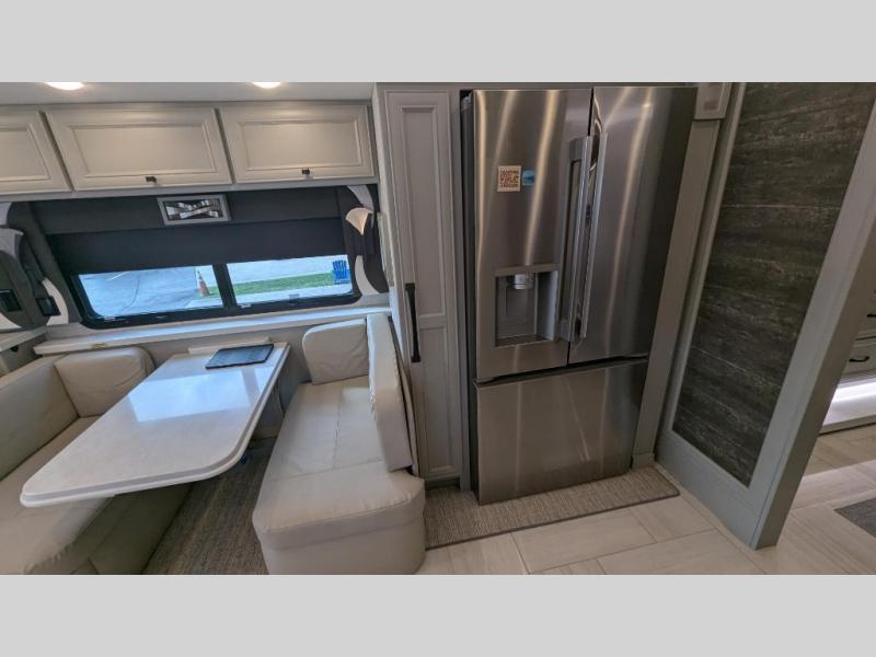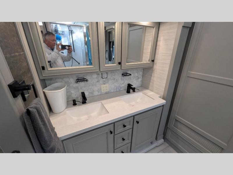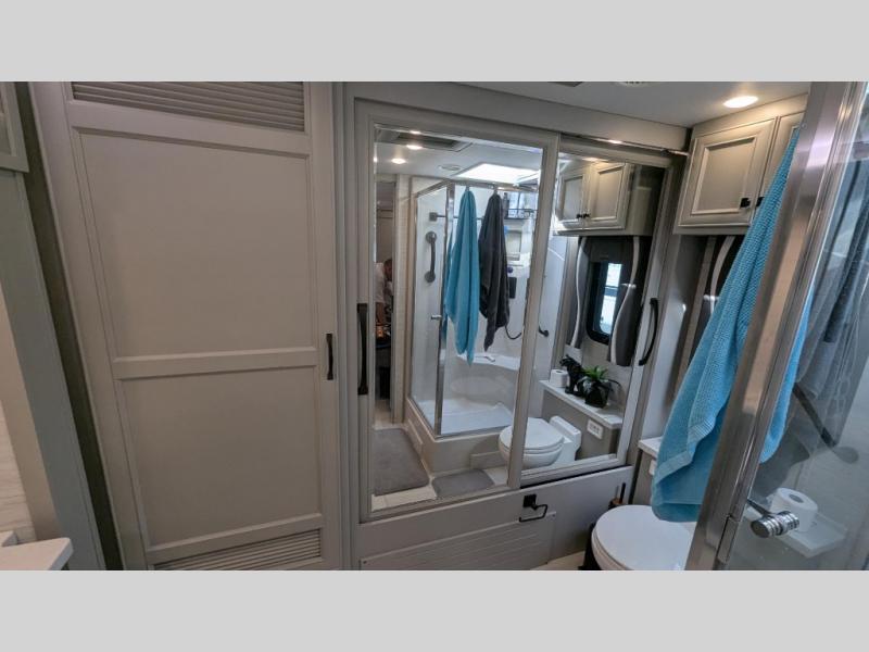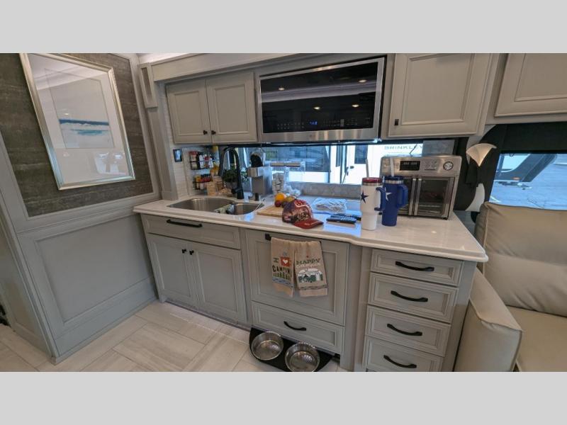 You will feel right at home in this coach with a master suite and king bed slide, mounted TV, laundry hamper, and stacked drawers. You all have quick access to the full rear bathroom. The bathroom not only has a dual sink vanity with a tri-view mirror for two to get ready at once, but also a shower with a seat and a large closet with an area next to it prepped to add an optional washer and dryer. The chef can prepare their best meals either indoors with the countertop extension and cooktop with convection microwave or outside if you add the optional outdoor grill. You can even watch the big game outside with the exterior TV with a sound bar!