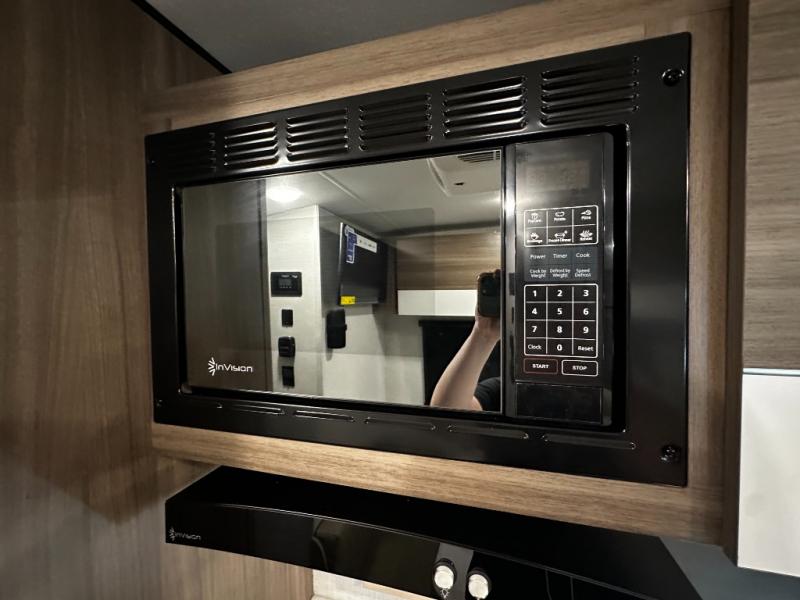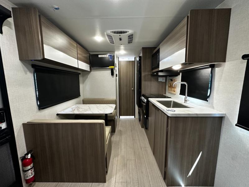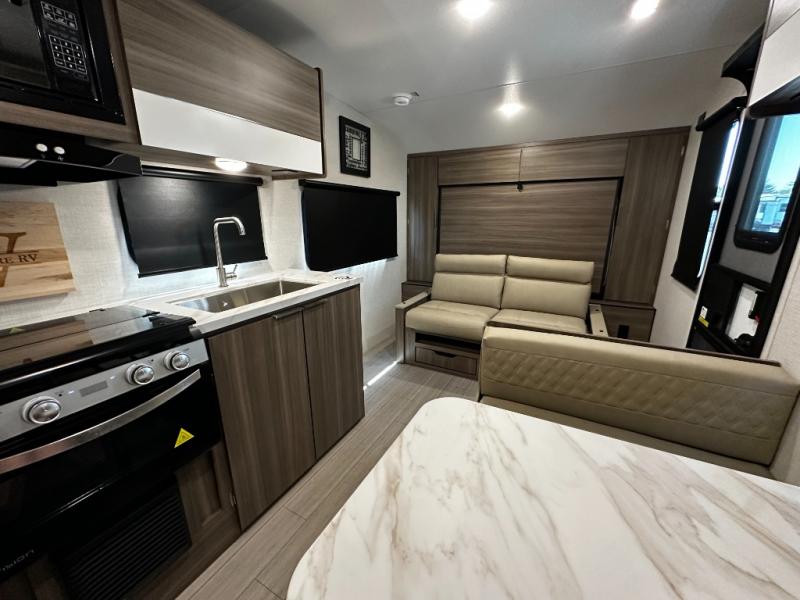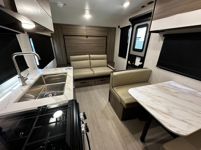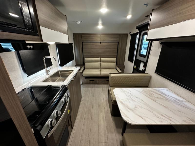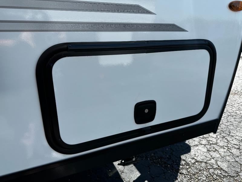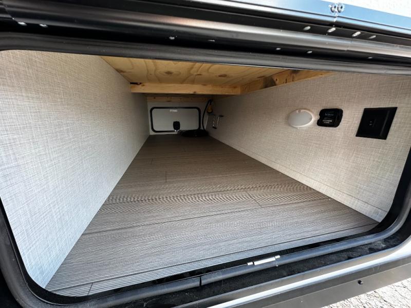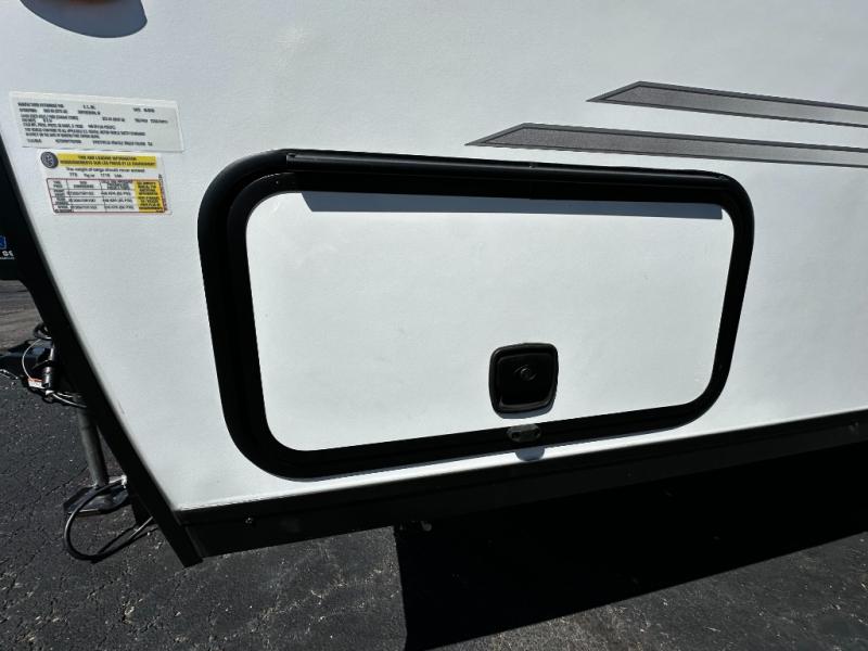 This versatile travel trailer gives you a sofa during the daytime to relax on up front and a Murphy bed to easily setup at night. There are dual wardrobes for your clothing, StorMore bedside nightstands with a 110V outlet and USB charging for your cellphones and such, and a rear full bathroom with linen storage in two places, a 34" radius shower, and medicine cabinet for more items. The galley kitchen offers appliances to make warm meals and store leftovers, and the booth dinette on the opposite side provides dining inside plus a sleeping space at night. Your outdoor gear can be placed in the pass-through compartment along the exterior, and you can always relax under the 13' power awning before and after the day's activities.