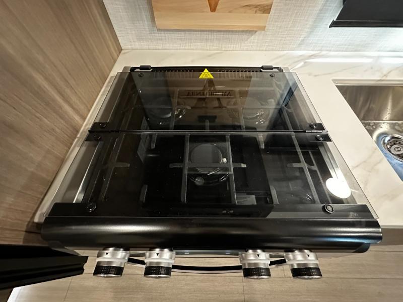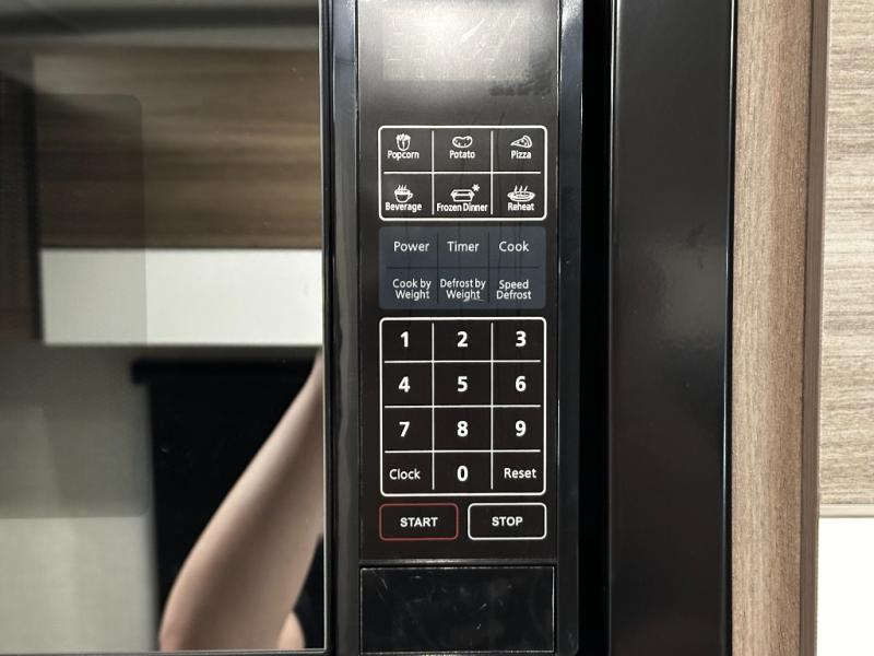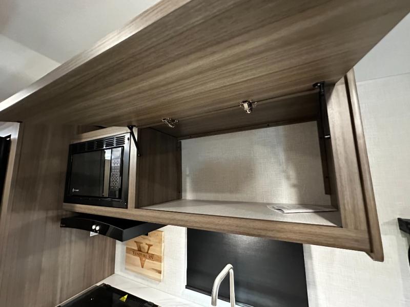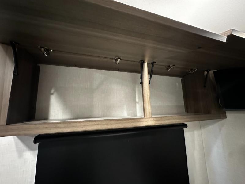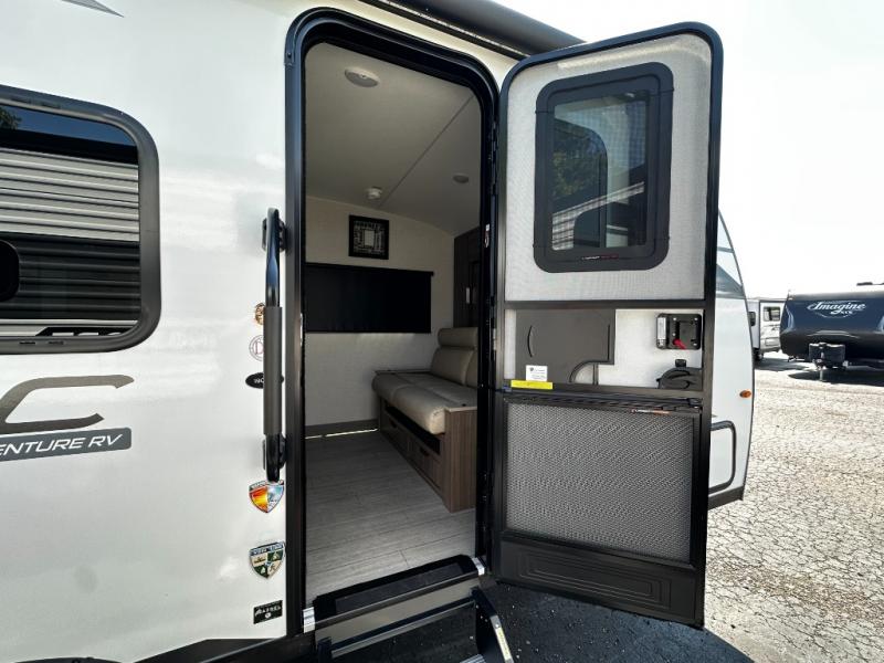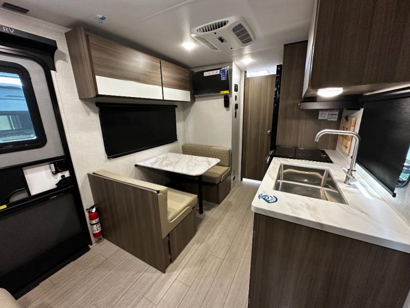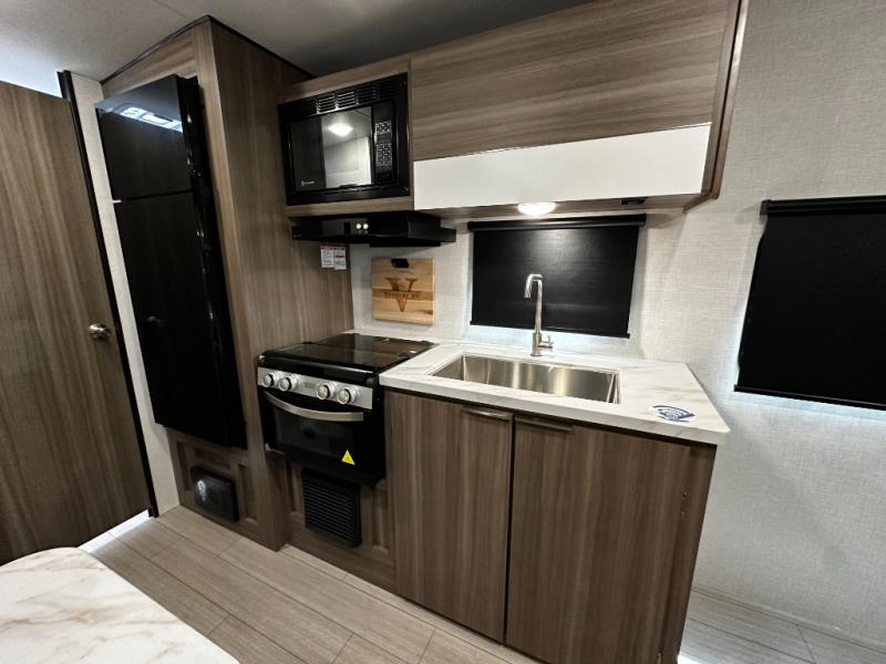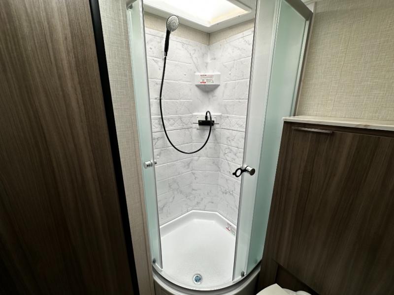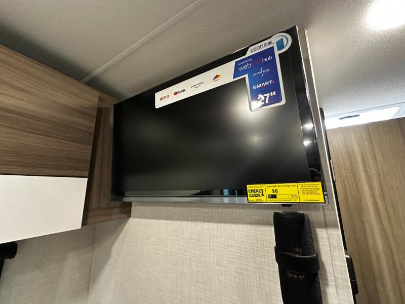 This versatile travel trailer gives you a sofa during the daytime to relax on up front and a Murphy bed to easily setup at night. There are dual wardrobes for your clothing, StorMore bedside nightstands with a 110V outlet and USB charging for your cellphones and such, and a rear full bathroom with linen storage in two places, a 34" radius shower, and medicine cabinet for more items. The galley kitchen offers appliances to make warm meals and store leftovers, and the booth dinette on the opposite side provides dining inside plus a sleeping space at night. Your outdoor gear can be placed in the pass-through compartment along the exterior, and you can always relax under the 13' power awning before and after the day's activities.