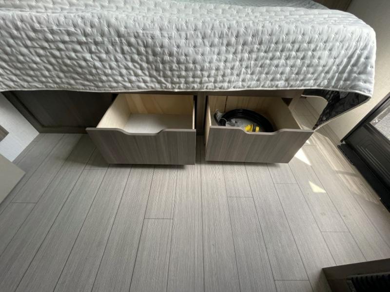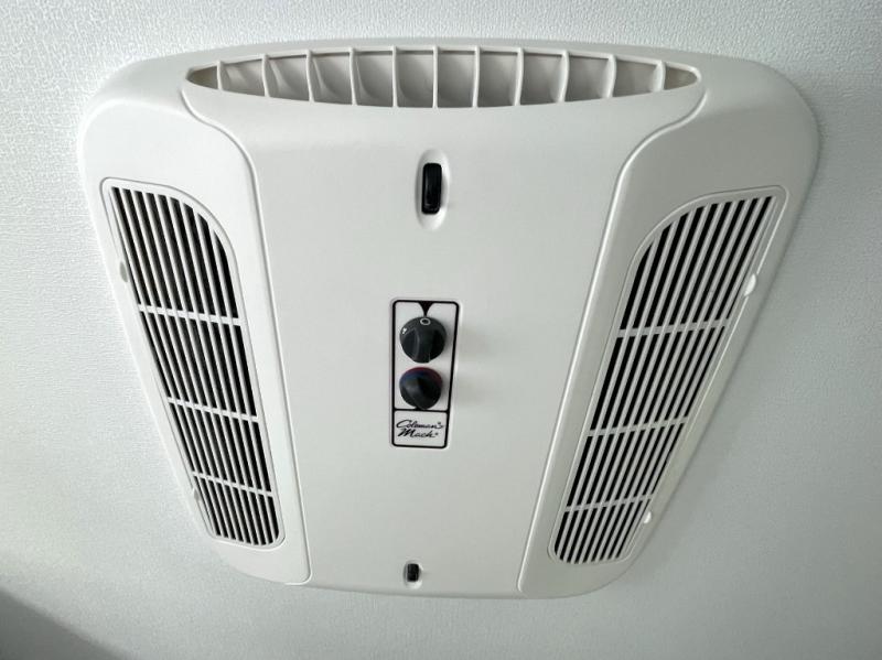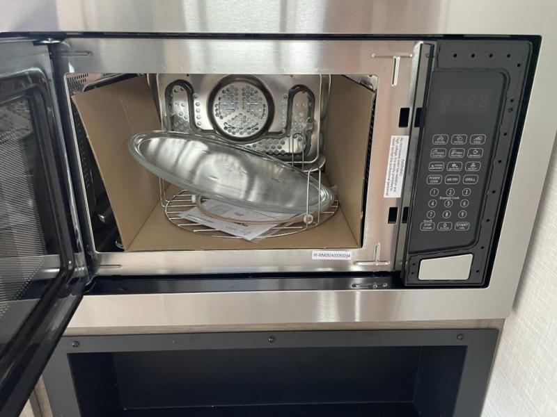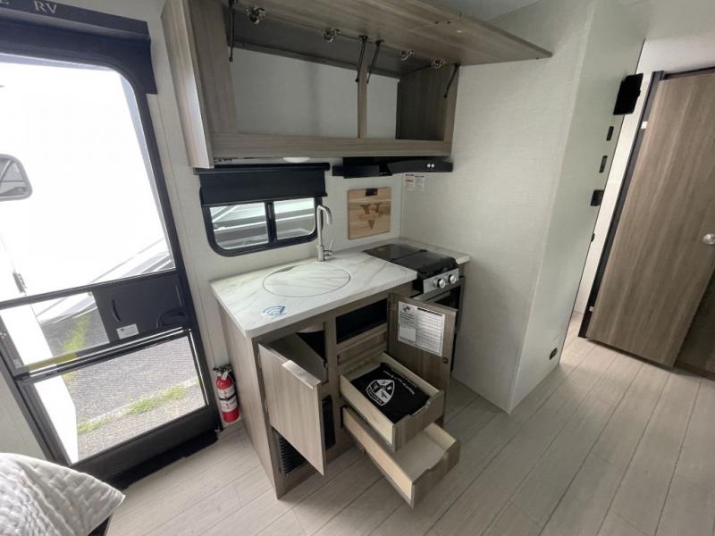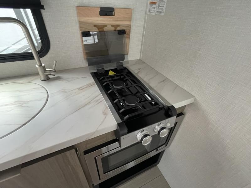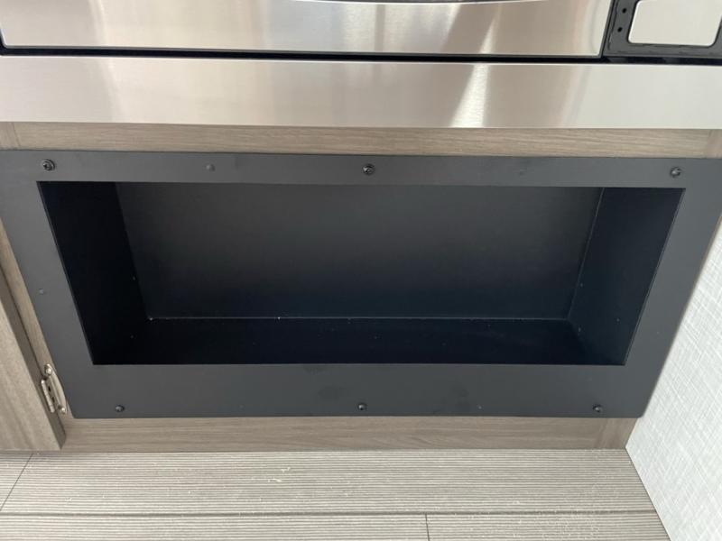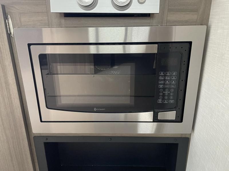 The galley kitchen includes a two burner cooktop, convection microwave, and deep round stainless steel sink with a cover to maximize counter space. Whip up quick breakfasts or full dinners with ease, then dine indoors or under the 12 foot power awning. A convenient pantry keeps all your snacks and ingredients within reach.