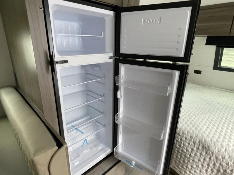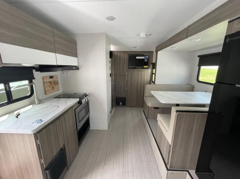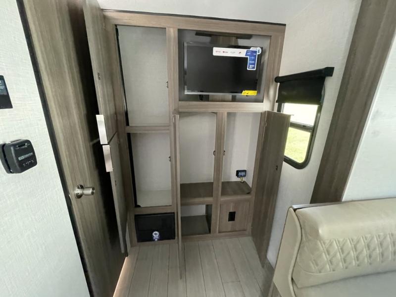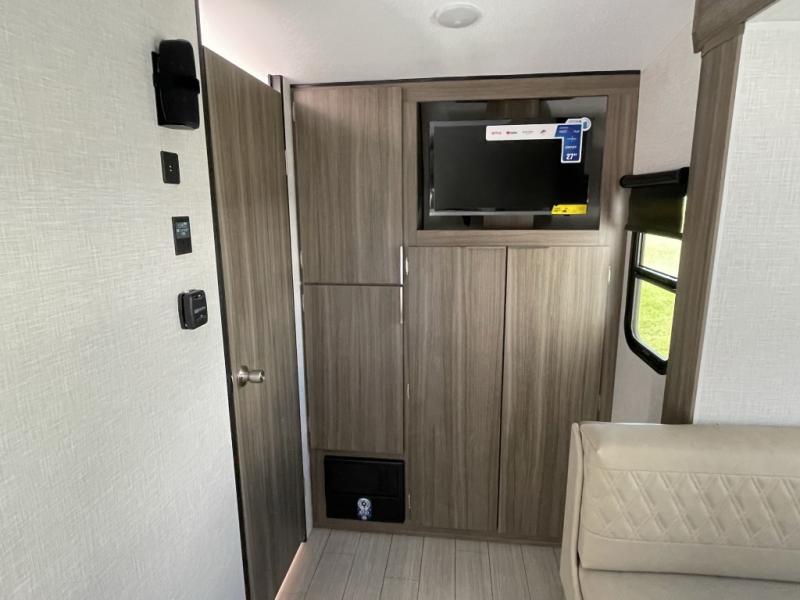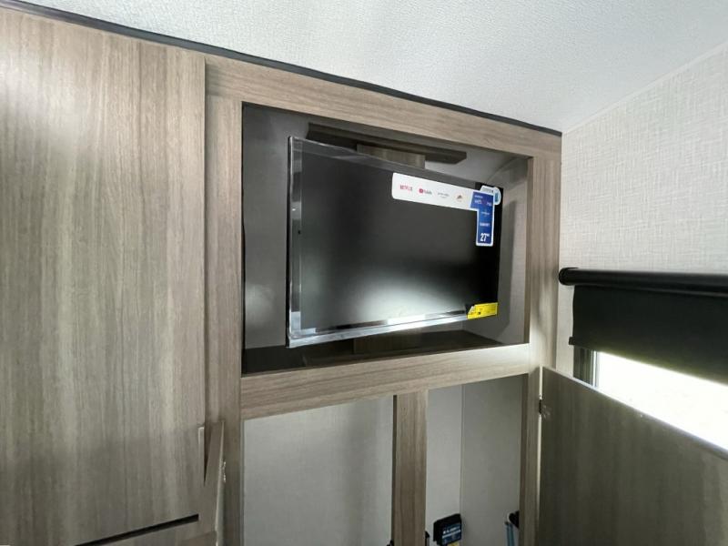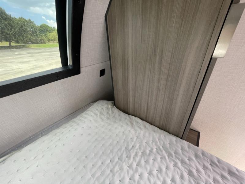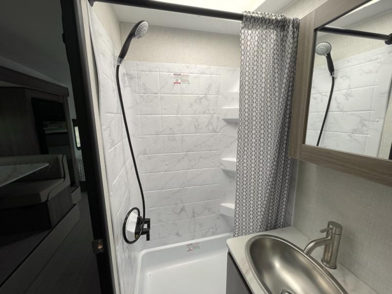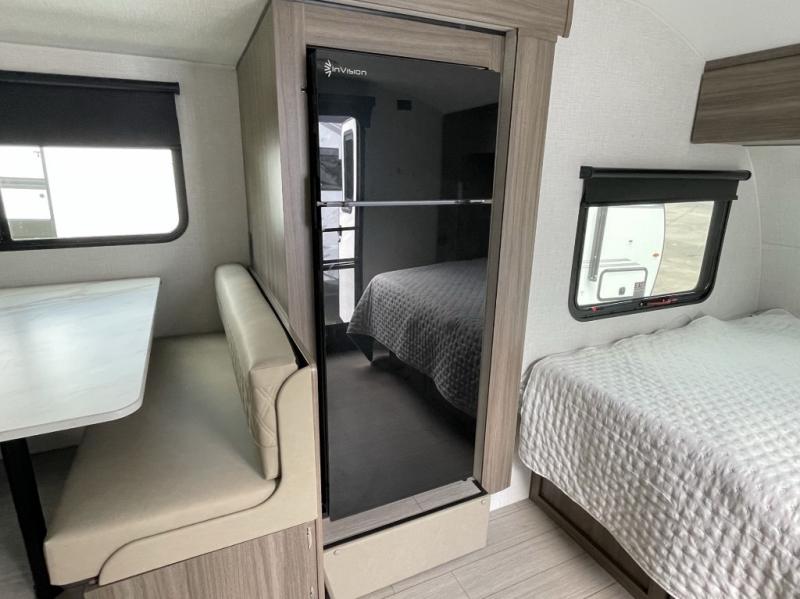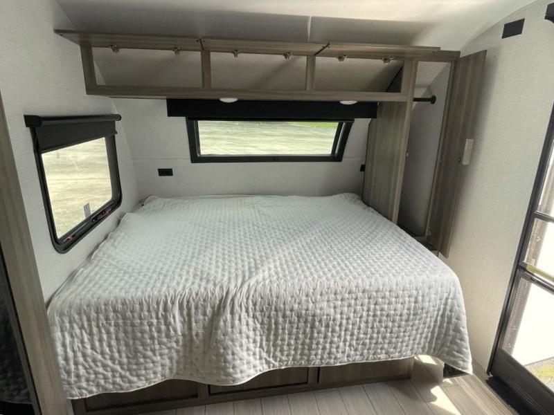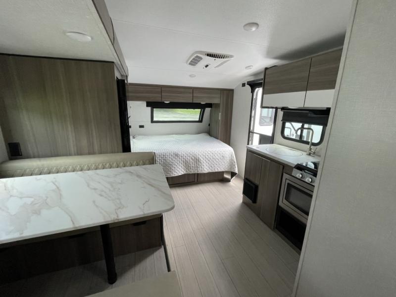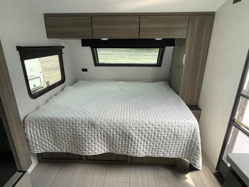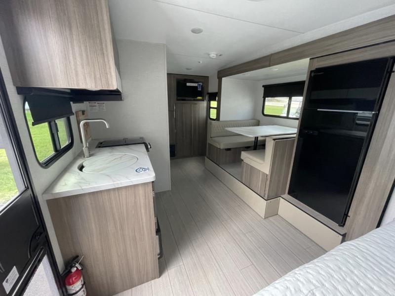 This compact yet spacious floorplan offers sleeping space for up to four campers. The RV queen bed at the front gives you a cozy place to rest, while the booth dinette converts to additional sleeping space when needed. A side wardrobe and overhead cabinets help you stay organized during every trip.