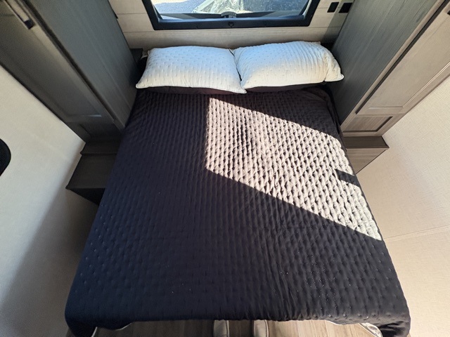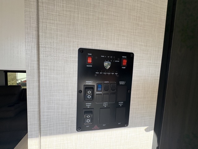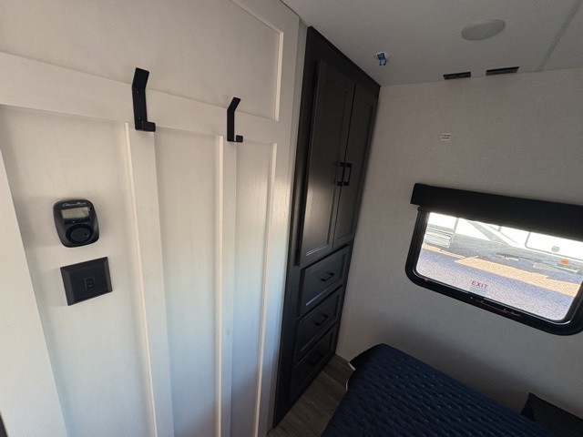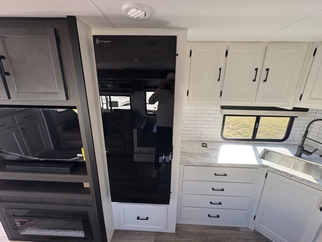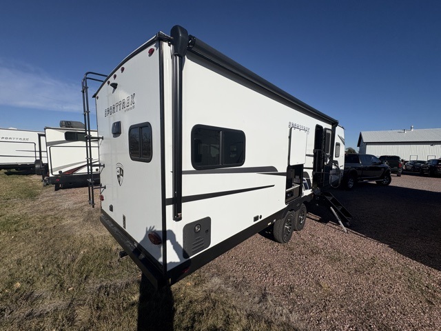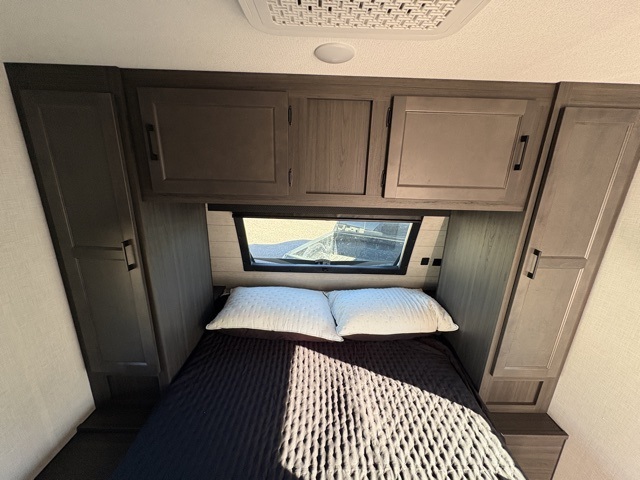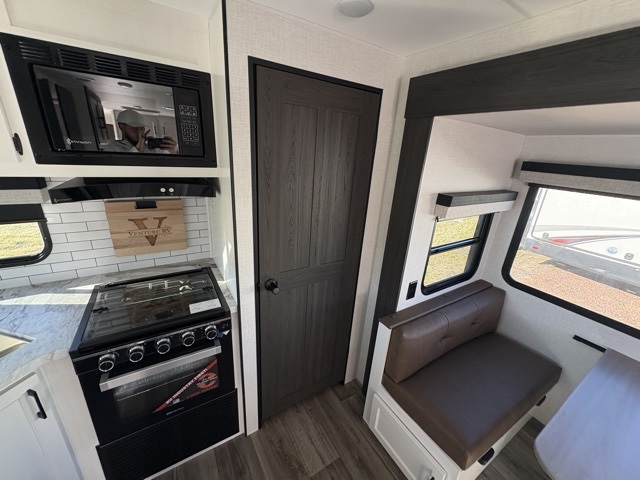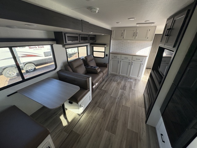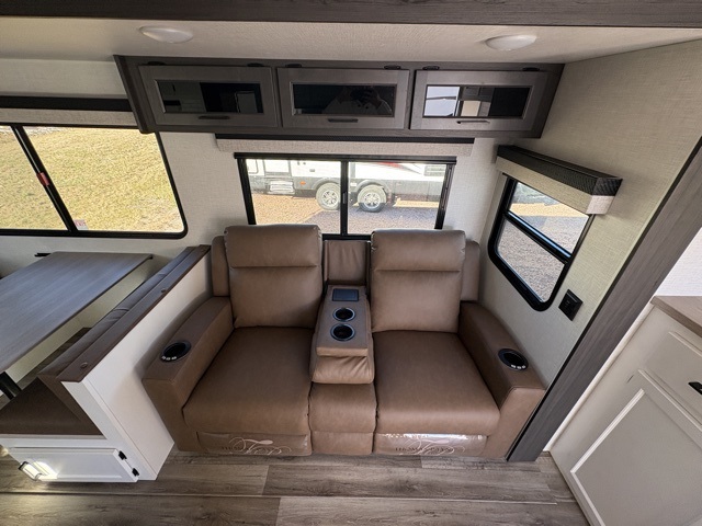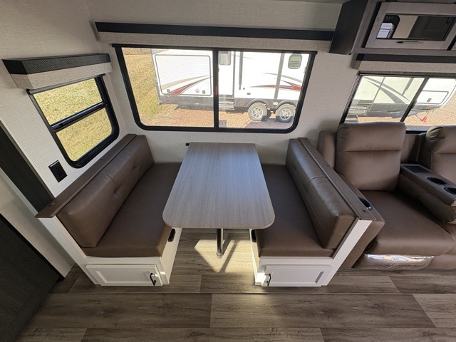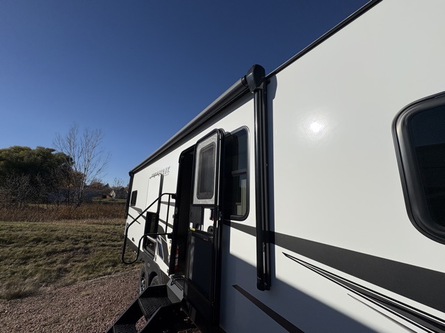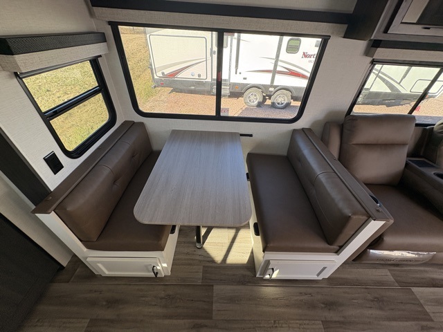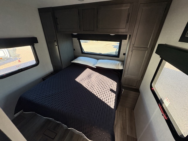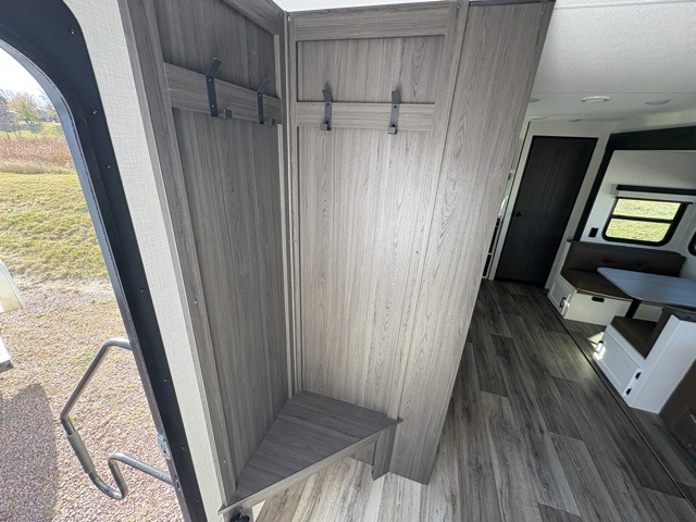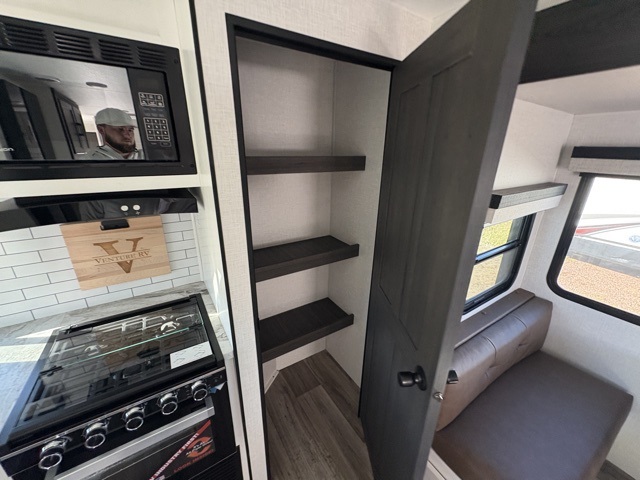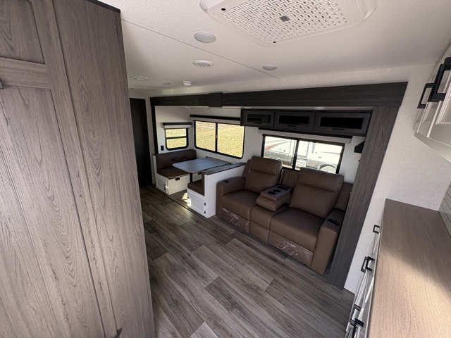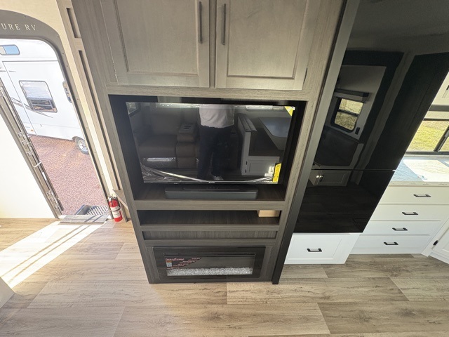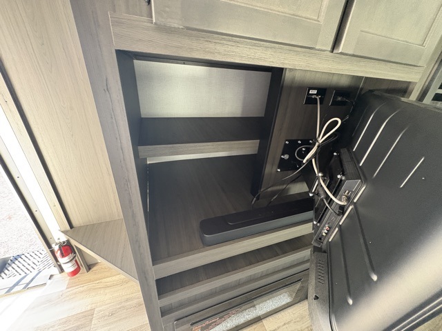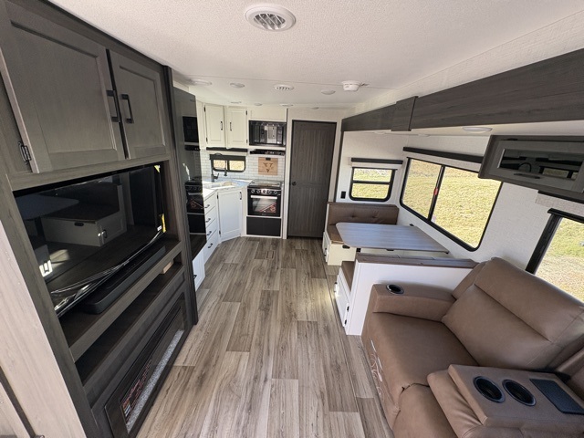 A rear kitchen makes it easy to prepare meals in this travel trailer! The kitchen has a three burner cooktop with a Furrion oven, a 10 cu. ft. 12V refrigerator to keep your perishables fresh, overhead cabinets keep cooking essentials nearby, and a walk-in pantry big enough for all of your snacks and canned goods, plus a hutch for your dishes. You could even prepare meals outside with the campfire café which has a sink, a refrigerator, and a griddle. The bench seat gives you a spot to sit while you put on your shoes and the coat hooks above makes it easy to grab and go. Enjoy your meals and card games at the Sit N' Slide table and relax on the 70" sofa across from the entertainment center with a 40" TV and a frameless electric fireplace. The front private bedroom has a Sleep Tight queen bed to lay your head on at night and a closet with drawers to keep your clothes looking their best!