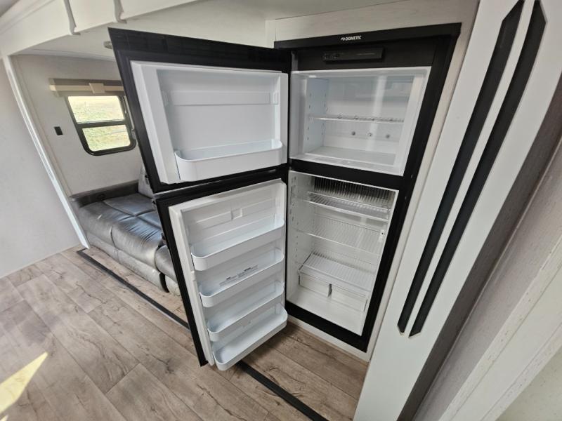 This travel trailer is perfect for two people looking to getaway for the weekend! It features a front private bedroom with a king bed to lay your head at night with wardrobes and nightstands on either side. You can prepare your best meals with the glass top three burner cooktop with a 17" oven and the 8 cu. ft. double door refrigerator then enjoy them at the 78" chaise lounge with a removeable table. The lounge is also conveniently across from an entertainment center with a 30" glass fireplace and a 40" LED TV. Inside the full rear bathroom is a shower to freshen up in each morning and a closet to keep your linens close.